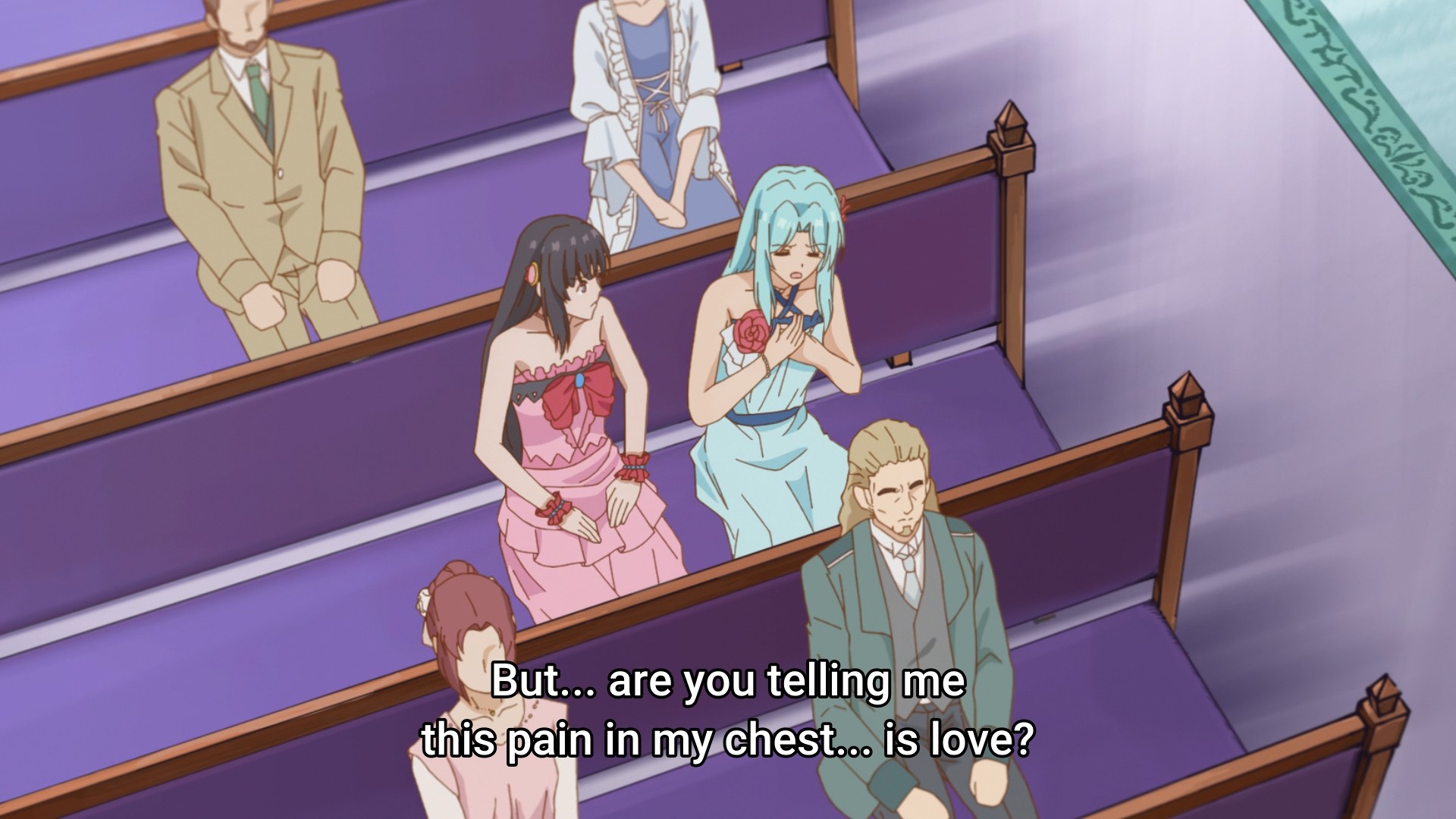 During the wedding, Icilla starts crying as she realizes that she might have feelings for Aquasteed after all. Or is it the game’s plot compelling her to act this way? The story is never clear on this. Also, Akari is someone who has been isekai’d like Tiararose, but Iciilla isn’t? What’s truly surprising, however, is that both Akari and Keith (his normie ass name cracks me up every time) are the ones to stop Icilla from ruining the wedding. I like how Akari and Tiararose are besties now. Even so, Icilla’s sobbing catches everyone’s attention. As a result, Aquasteed has to pause the wedding, literally princess carry Tiararose back to the pew where Icilla is sitting, and boldly declare his love for his soon-to-be wife. Kinda ridiculous, ain’t it? He’s about to marry the damn woman, so I sure do hope that he loves her. First, they should’ve just let it slide. After all, people cry all the time at weddings. Why assume that Icilla is doing it because she’s against their union? Second, this sort of thing would cause a huge uproar in any wedding, much less a royal one. But you don’t hear so much as a peep from the rest of the wedding goers. Finally, where was Tiararose’s grand gesture when Keith was disrespecting their relationship in last week’s episode? Nah, I’m not letting it go, man. Keith gets to feed Tiararose a cupcake by hand, but Aquasteed turning to look in the direction of the sobbing Icilla is enough to make our heroine insecure? Girl, please. I’m telling ya, Tiararose ain’t it.