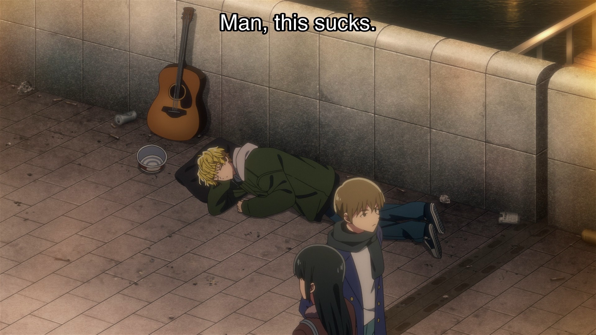 One day, Asuka got injured defending him against his deadbeat father, so Natsuki blamed himself for “ruining” her life. He still blames himself to this day. Okay, fine, she couldn’t compete in a tournament. That was a big deal, but that also wasn’t “her life.” Her life wasn’t a fucking high school martial arts tournament. I know kids tend to blow things out of proportion, but it’s been years now. Enough years for Asuka to grow up and become a teacher, which is hopefully a career that she’s passionate about. Ergo, she’s found a new calling and thus her life is hardly in ruins. Time for Natsuki to get some perspective if he’s going to be an adult. If anything, the fact that his girlfriend defended him should’ve made him love her even more — made him want to dedicate himself to her happiness even more. But what did he do? He used it as an excuse to stop trying. He ran away. When the going gets tough, this guy bails. My stance has hardly changed; I think it’s bullshit that the agency puts all of the songwriting responsibilities on Natsuki’s shoulders. But if he wants to use this sob story as an excuse for why he can’t be motivated in life, then the only thing that’s sad here is him. He needs to grow up.