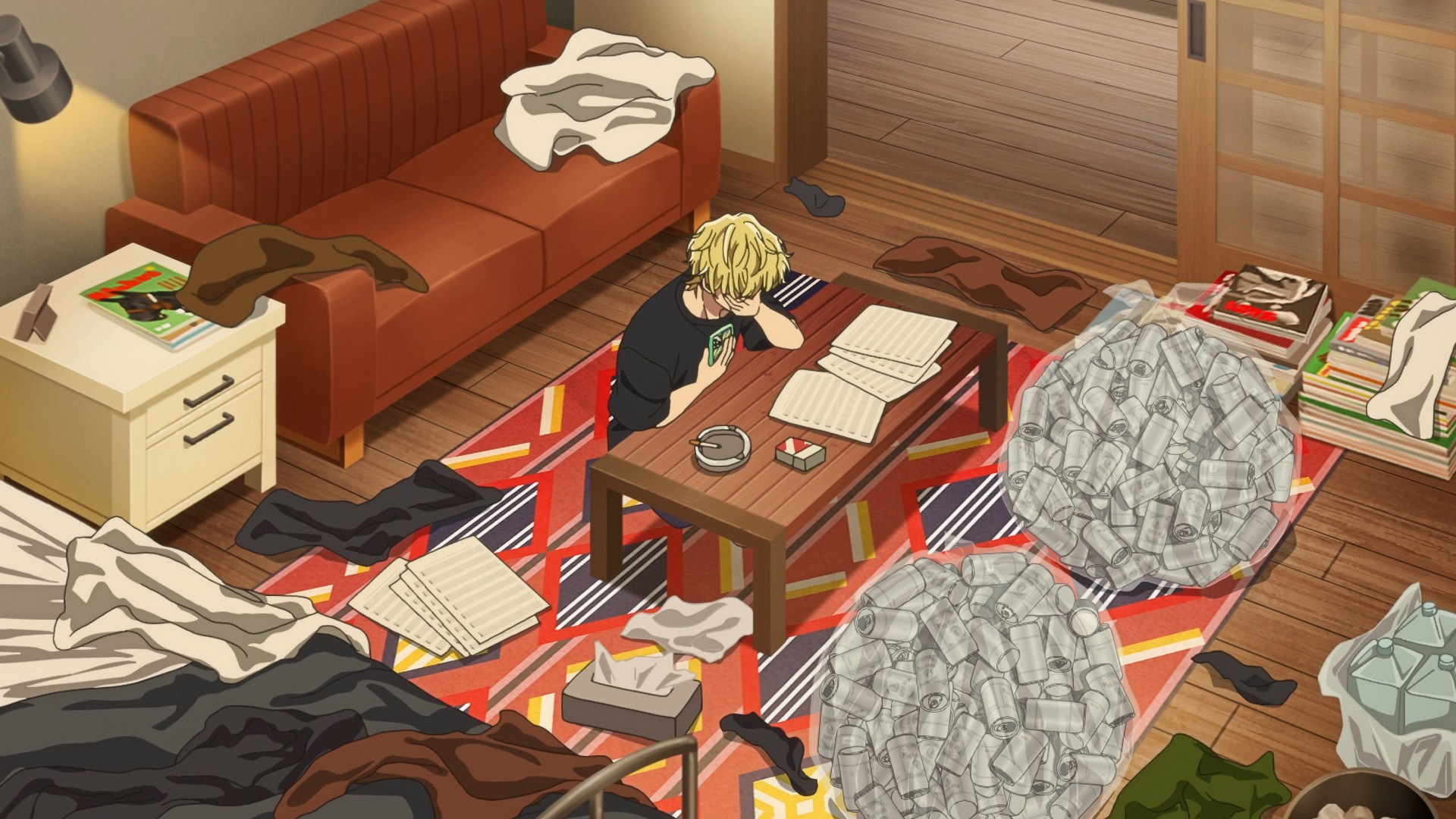 In the end, Asuka still won’t meet with Natsuki face to face, but she throws him a concession by posting an encouraging message on social media. He then realizes that she’s been supporting him since his debut, so she hardly hates him. I guess that’s enough to kick his ass into gear. But I think the agency might want to drag him to the hospital and make sure his liver is okay. Sheesh, look at all those beer cans. Anyway, it might not matter what Asuka wants, because F/ACE is apparently going to do a shoot at Hanagaya High, i.e. the same school she teaches at and Utage attends. What a coincidence.