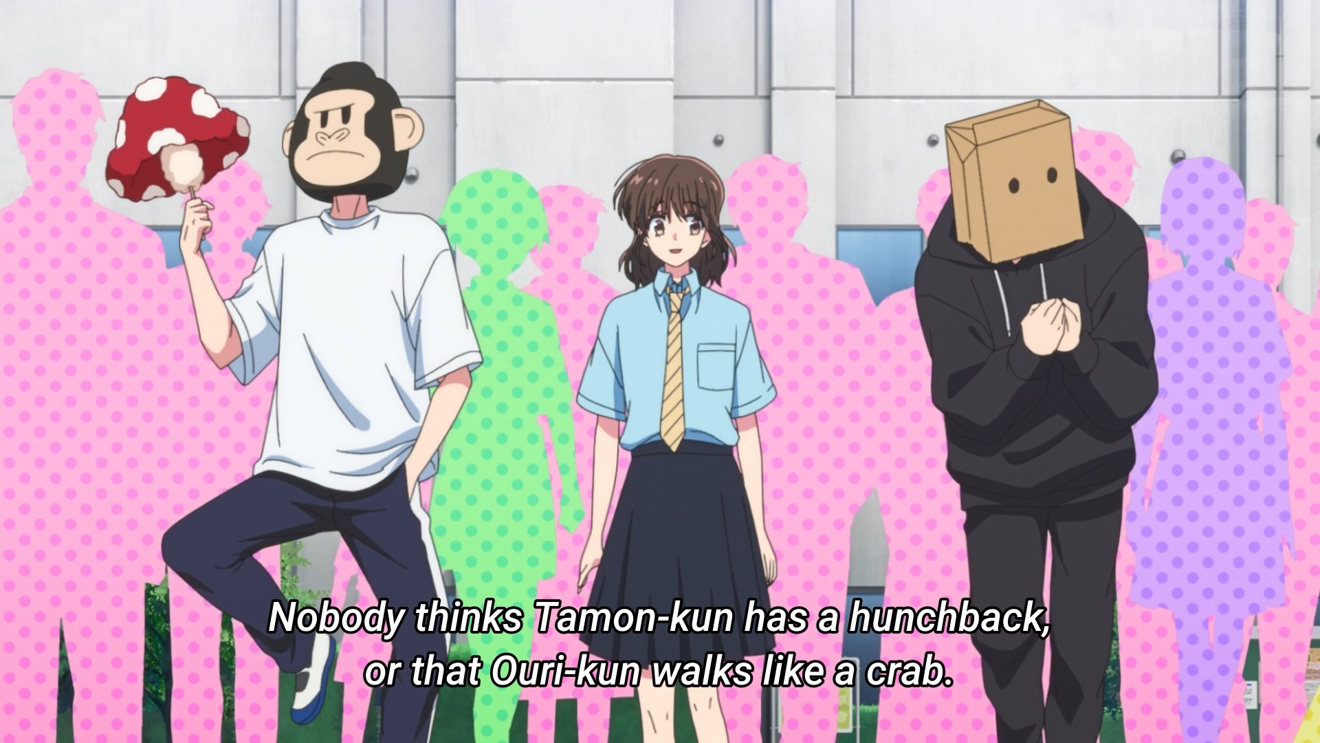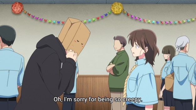 — Why a milk carton for Keito? What does that symbolize? Is he lost? Nevermind, I don’t even know if missing people on milk carton is even a thing outside of the US. Even then, we stopped doing this around the mid-90s. Anyway, maybe there’s no real meaning behind any of the masks, because Natsuki is apparently a traffic cone.