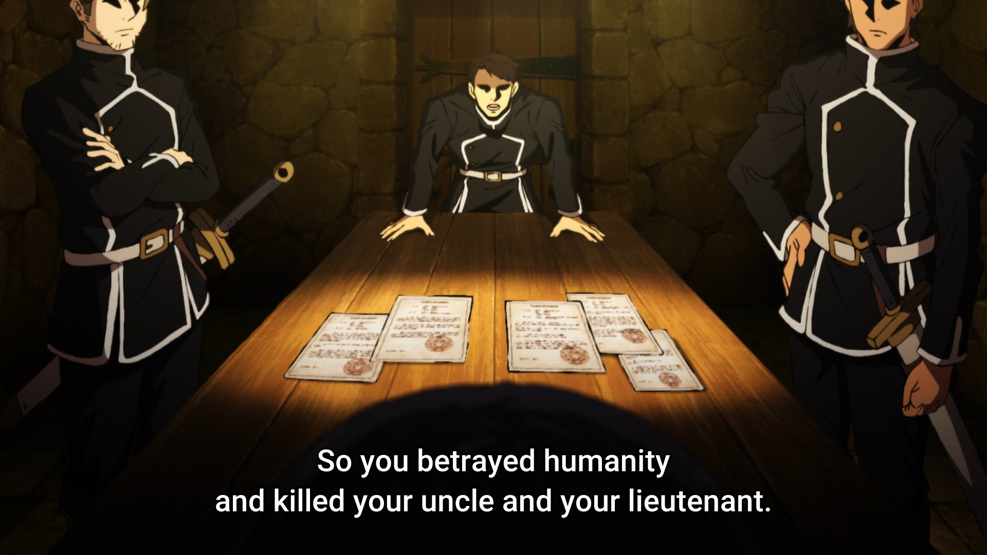 Elsewhere, the captain of the Thirteenth Order has her worst fears confirmed by Frenci: her uncle is a filthy coexister. As a result, she tries to have him arrested, ’cause she probably still assumes that this is a just world. She assumes that she can convince him to atone. To put it another way, this confrontation is the real climax of the show. After all, I would love to know what deeply motivates folks like Marlen to betray their own kind. Sure, you can toss out one-word concepts like greed, but I expect a compelling conversation — a battle of opposing worldviews, if you will — between a man of the cloth and the niece who once looked up to him as if he had been her own father. And at first, we kinda get that…? Like Shiji Bau, he claims to be doing all of this in order to the protect the people he cares about, including his own congregation. But immediately, alarm bells should go off, because what sort of religion are you preaching if you’re willing to abandon “complete strangers?” That certainly doesn’t sound like any religion I want to follow. As a result, Marlen’s next move doesn’t surprise me: he immediately tries to murder his own family, which calls into question whom exactly he actually cares about. But that’s how it always is with the hopelessly immoral.