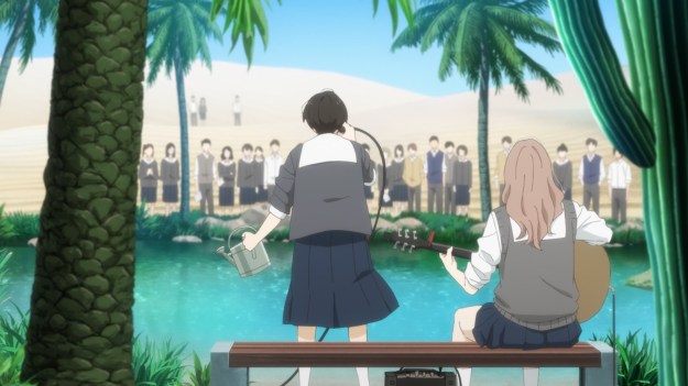 After steeling her nerves, Asa sings her song in front of a crowd at school. Her performance draws an applause. Afterwards, Chiyo starts going to school regularly again. You can’t attribute that to just Asa’s singing, because correlation doesn’t always mean causation. But we do know Chiyo liked the song. Plus, Asa’s performance did at least earn her club a recruit or two. In the moment, Asa doesn’t know whether or not she can change the world. She doesn’t know if her words and actions will eventually carve out that canyon. Who can say if a flower will bloom in the desert if you keep watering it? But she wants to hold onto that desire anyway. It’s more important to continue wanting to change the world even if you believe you can’t.