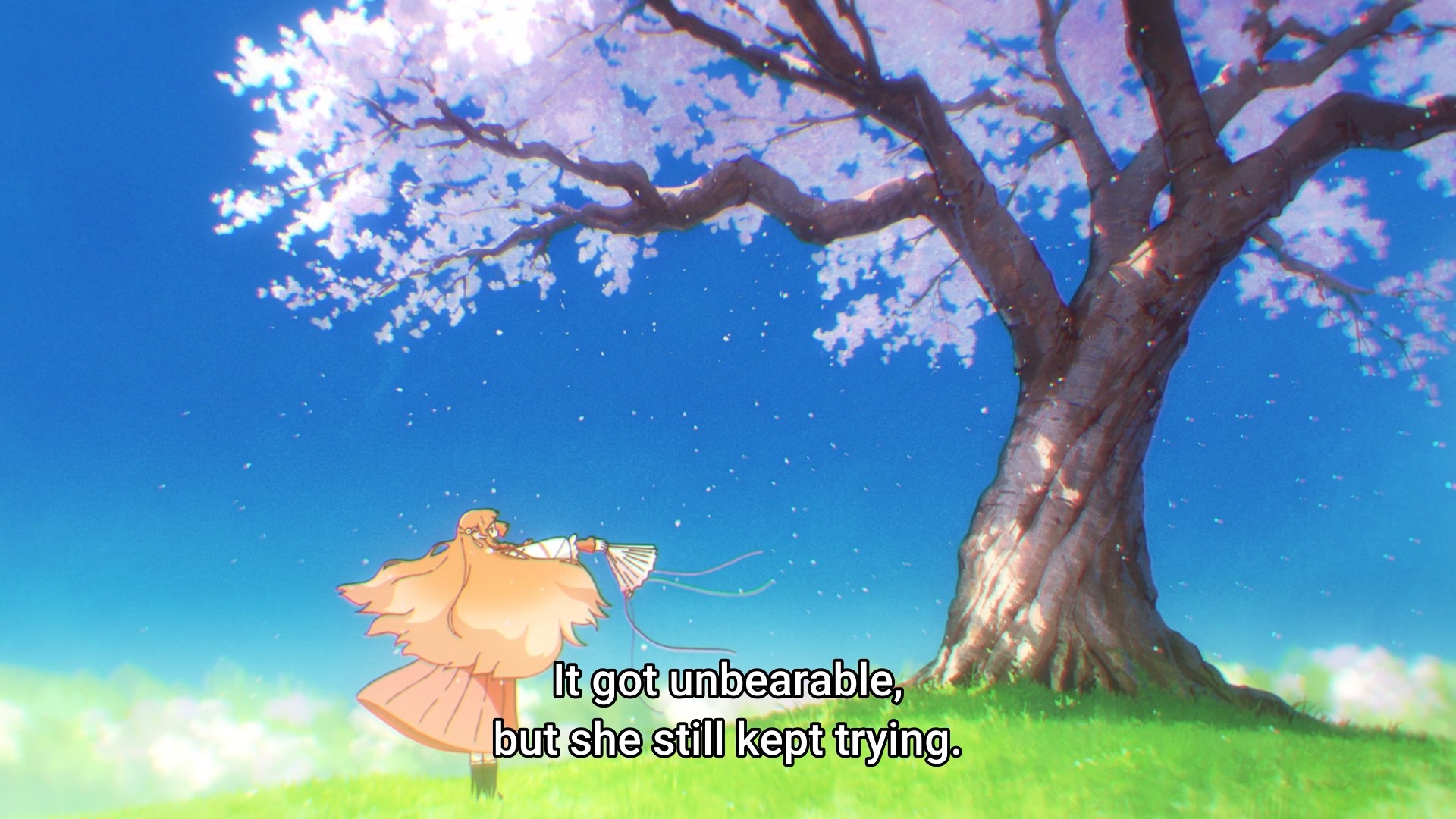 Thankfully, HInagaiku is now free, and she’s on a journey to bring a little green back in our lives. But for some reason, she has to do this in secret. I assume it’s because the people who kidnapped her are still out there. And then in the process, we’re supposed to shed tears as people reflect upon the passing of the seasons. The first episode features little girl who refuses to forget her late mother, so she makes the long trek up the mountains in order to shovel snow from her mother’s grave. But now that spring is here, she can move forward like, um, the seasons!