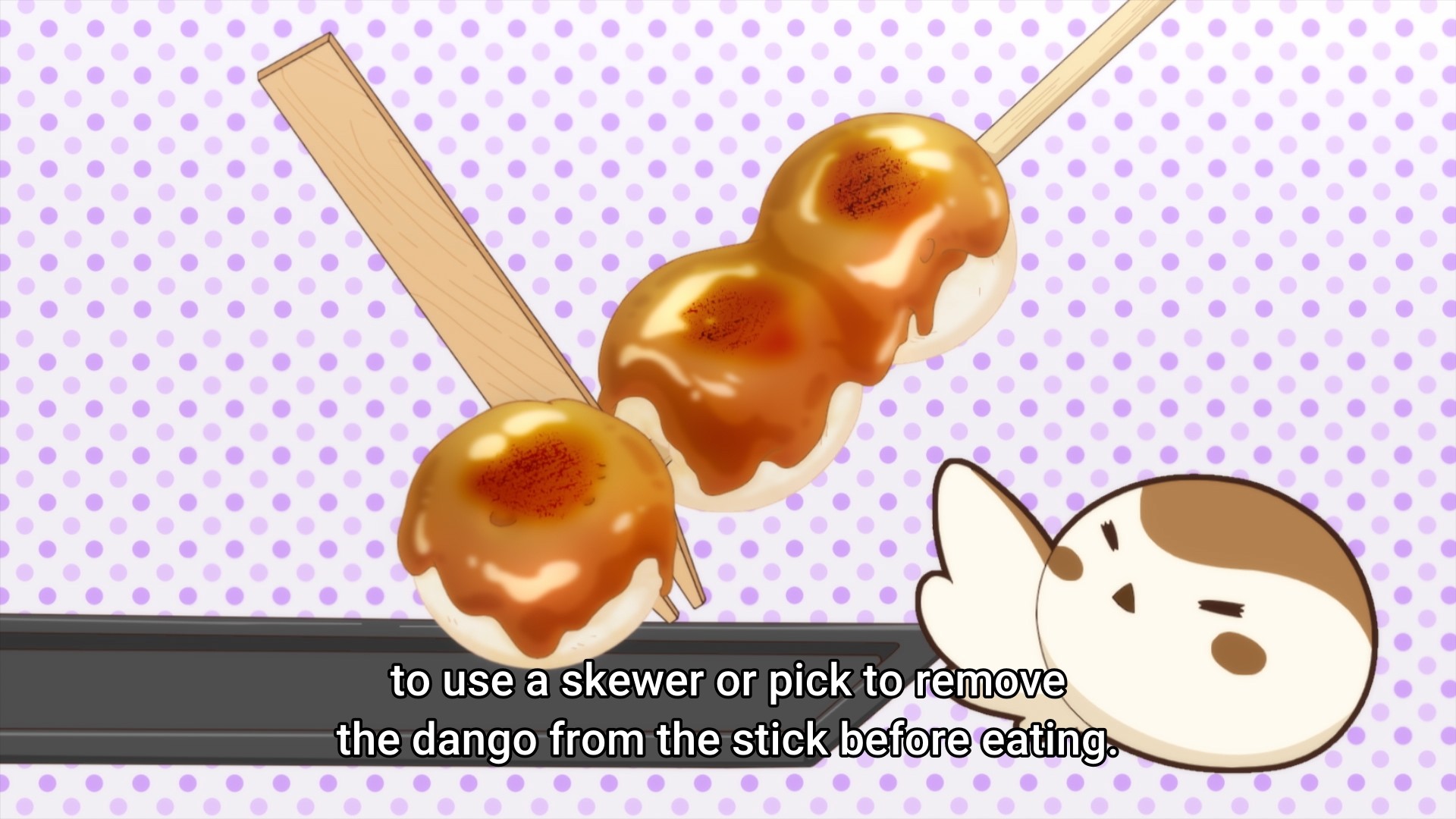 I mean, takoyaki as the second snack? Practically every anime out there already extols the virtues of takoyaki. Next, we get instructions on how to eat dango sitting in the middle of a skewer. How is this remotely interesting? Who is this for? What Japanese kid out there doesn’t know about taiyaki, takoyaki, and dango? That’d be like me making a Sunday morning cartoon to talk about about hamburgers and tacos.