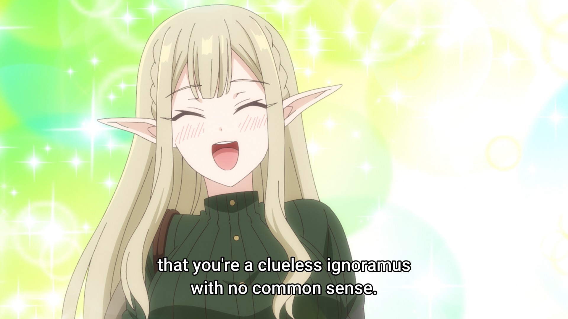 This show feels like the author’s barely disguised fetish. The elf heroine’s breasts pop out of her shirt at least three times throughout the episode. Just wear a fucking sweater at that point, christ. Even when they’re fully clothed, however, her breasts loom threateningly over the main character in practically every scene like twin Death Stars.