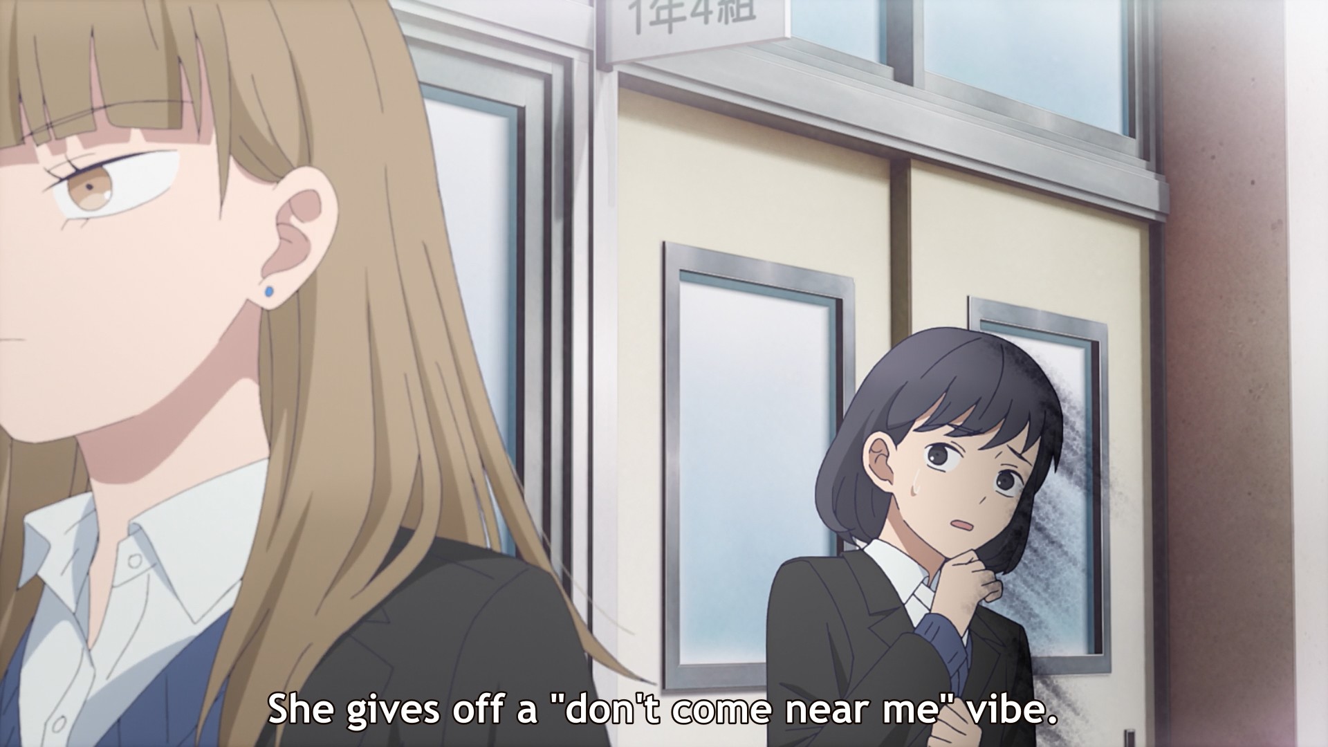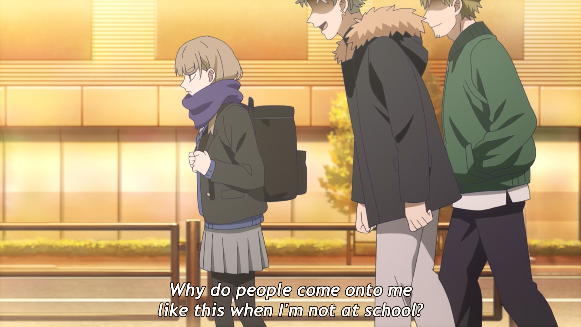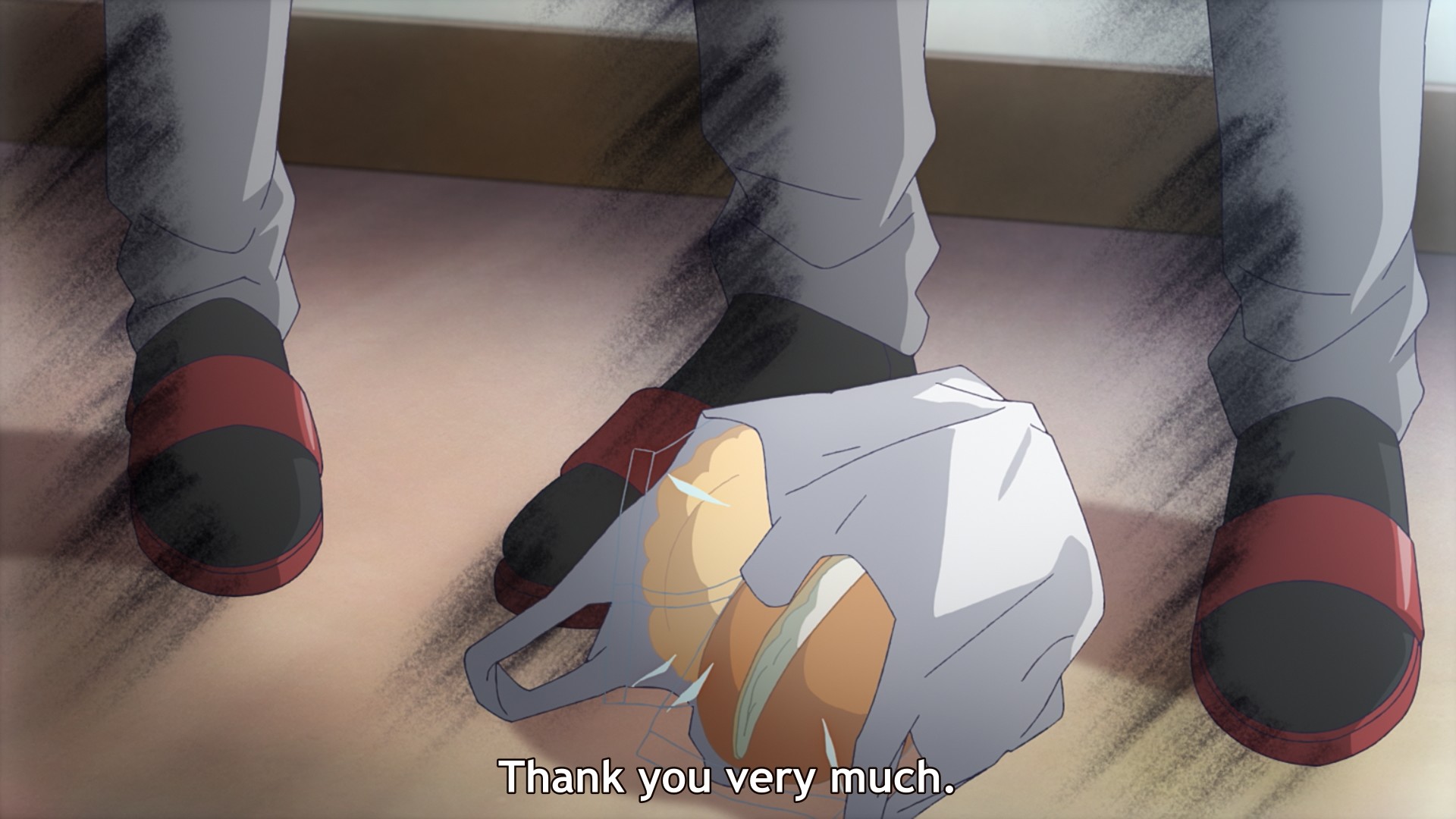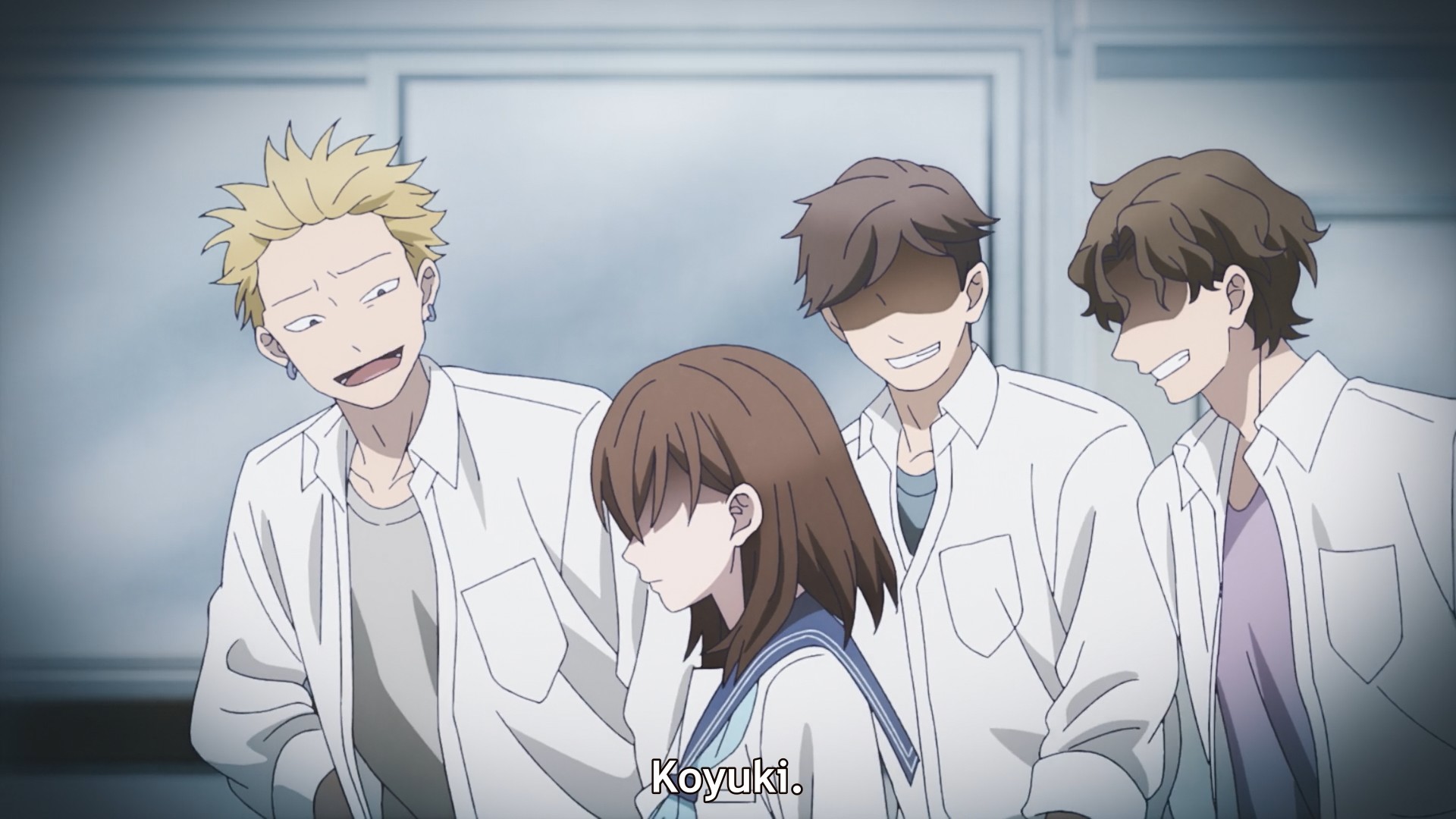 Again, I’m not vibing with the dramatics. Who gets scared so much by somebody’s eyes that they literally drop their lunch? Who cowers when someone like Koyuki walks by? I hate it when anime exaggerates. It tricks people (usually impressionable kids) into thinking that they’re main characters. That awkward kid who mean mugs his way down the hallway because he thinks all the normies are against him? You can probably blame that on edgy AMVs set to Linkin Park’s “In The End.” In reality, people don’t actually care about you to such an extent. They often don’t care about you at all. But people overreact a lot in this show. For example, Koyuki doesn’t know how to react to a guy trying to make her laugh by mimicking what she did earlier in the episode — at least, that’s what I think that’s his intent — so she gives an awkward smile before ducking away. In response, one of the guy’s friends calls her creepy. Huh? What’s creepy? The awkward smile? Again, isn’t that a bit of an overreaction? Nobody has any chill.