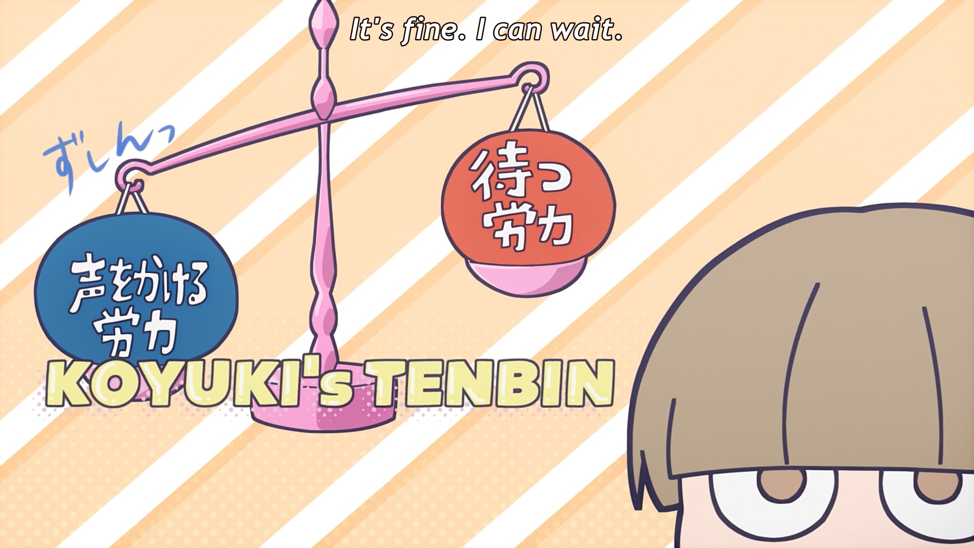 Unfortunately, Koyuki is also kind of a pushover. She complains a lot, but only with her inner voice. For example, when someone takes her seat, she doesn’t speak up. She just lets it happen. The other girl only ends up moving because she sees Koyuki’s resting bitch face. So sure, Koyuki’s “ramparts” end up working, but only inadvertently. Asking someone to give you your seat back should be a cinch. Is this why Tani ended up being an introvert who can speak his mind? Point is, I like headstrong characters. If you’re dissatisfied with the world, then do something about it. Koyuki, however, is unhappy about the world and too passive to do anything about it. Hopefully, her eventual character development at least teaches her to become her own champion.