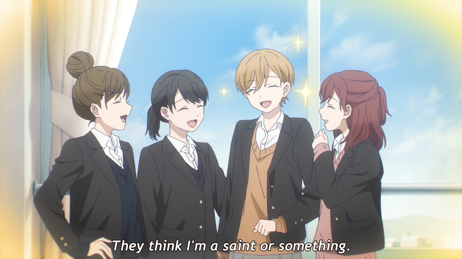 And yet, despite Koyuki’s seeming unpopularity with the rest of her classmates, she’s besties with the school idol. Minato, the extrovert, also realizes that Koyuki deliberately distances herself from others, so he seems determined to become her friend. But is he doing it out of the goodness of his heart? Or is he doing it because he sees a challenge and he’s undaunted? Maybe a little of both. And then there’s the giraffe guy who keeps fortuitously bumping into Koyuki all throughout the episode. I dunno, so far, I’m not optimistic about the show. I hope Koyuki mellows out, and as a result, we turn the dramatics down a couple of notches. And at the moment, I’m not hoping for any romance, because I’m not feeling it with either of the boys. But it’s only the first episode, so I should let everything play out. I did not get too far into the manga, so a lot of this will be completely new to me.
