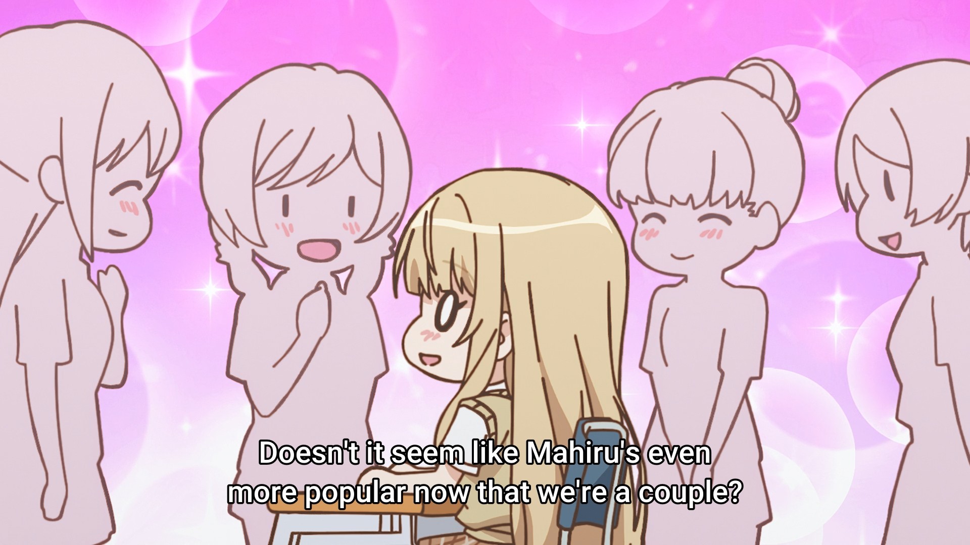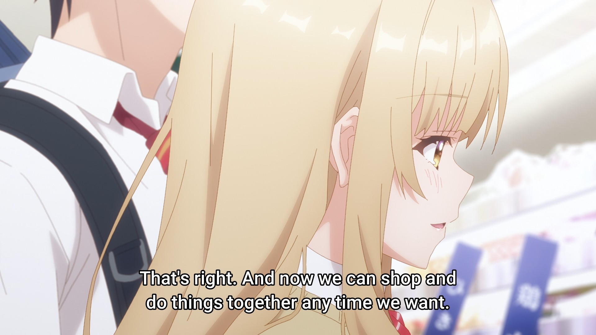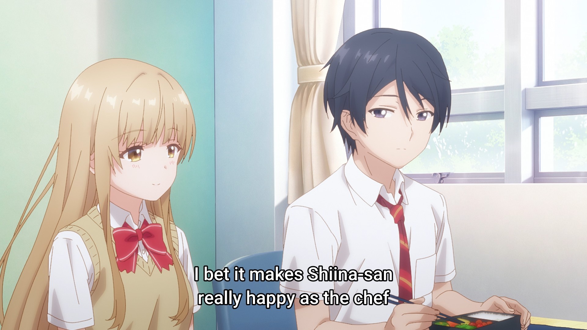 When I finished the first season, I remember coming away from it thinking that the relationship at the heart of the show was rather cloying. Well, the second season sure hasn’t betrayed that thought. The two kids start the sequel off by talking about their relationship. Then they wake up in the morning and talk about their relationship. They walk to school and talk about their relationship. They meet their friend, who of course has to congratulate them on their relationship. They sit in class and talk about their relationship. At lunch, they eat with their classmates and talk about their relationship. On their way home from school, they talk about their relationship. They go shopping for dinner and talk about their relationship. The next day, they still talk about their relationship. From the very first second of the episode to the very last second of the episode, they talk about their relationship. Holy shit, give it a fucking rest. You can still have lovey-dovey moments, but jeez, tone it back a little. You can enjoy each other’s company without constantly talking about yourselves.