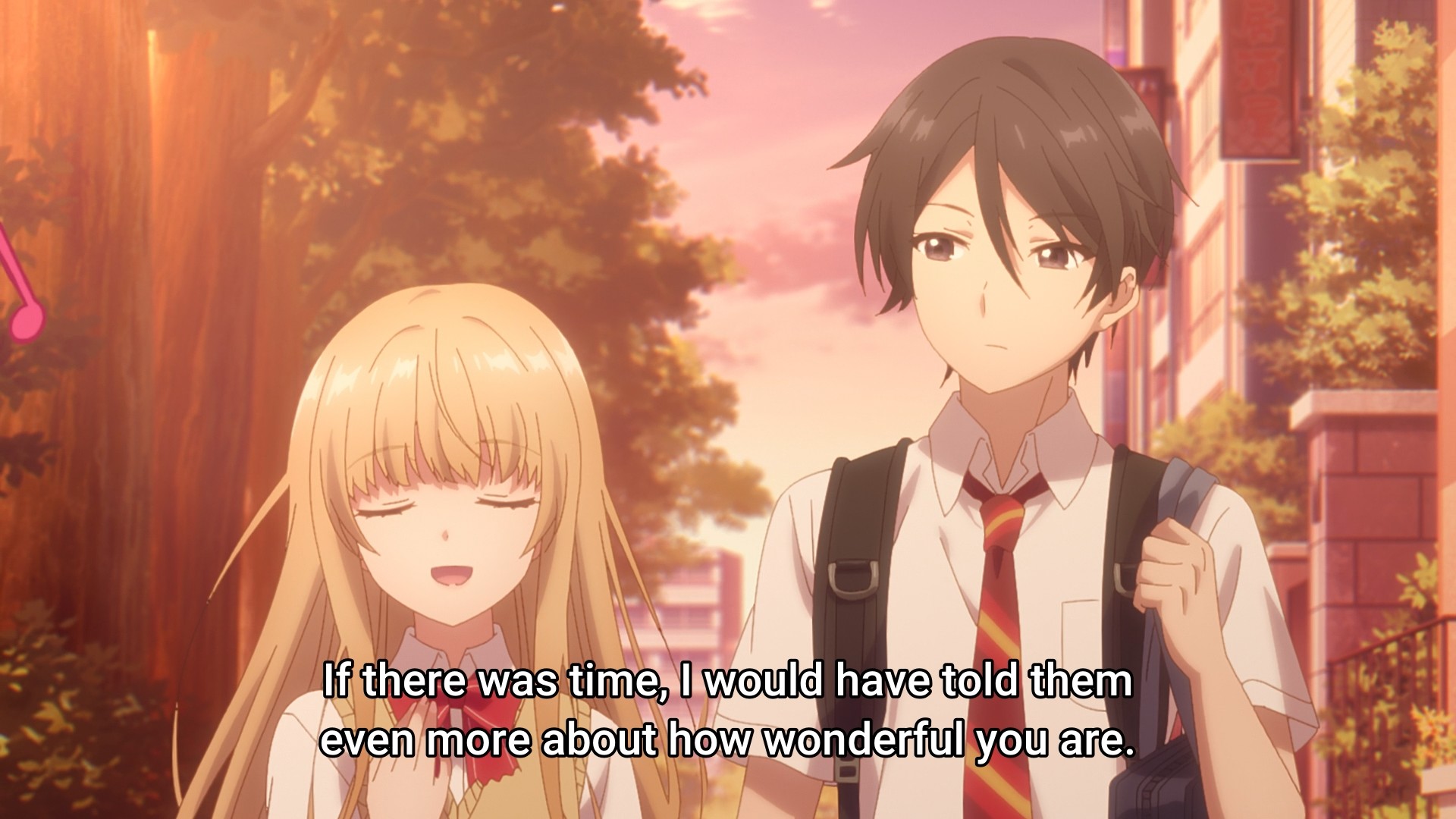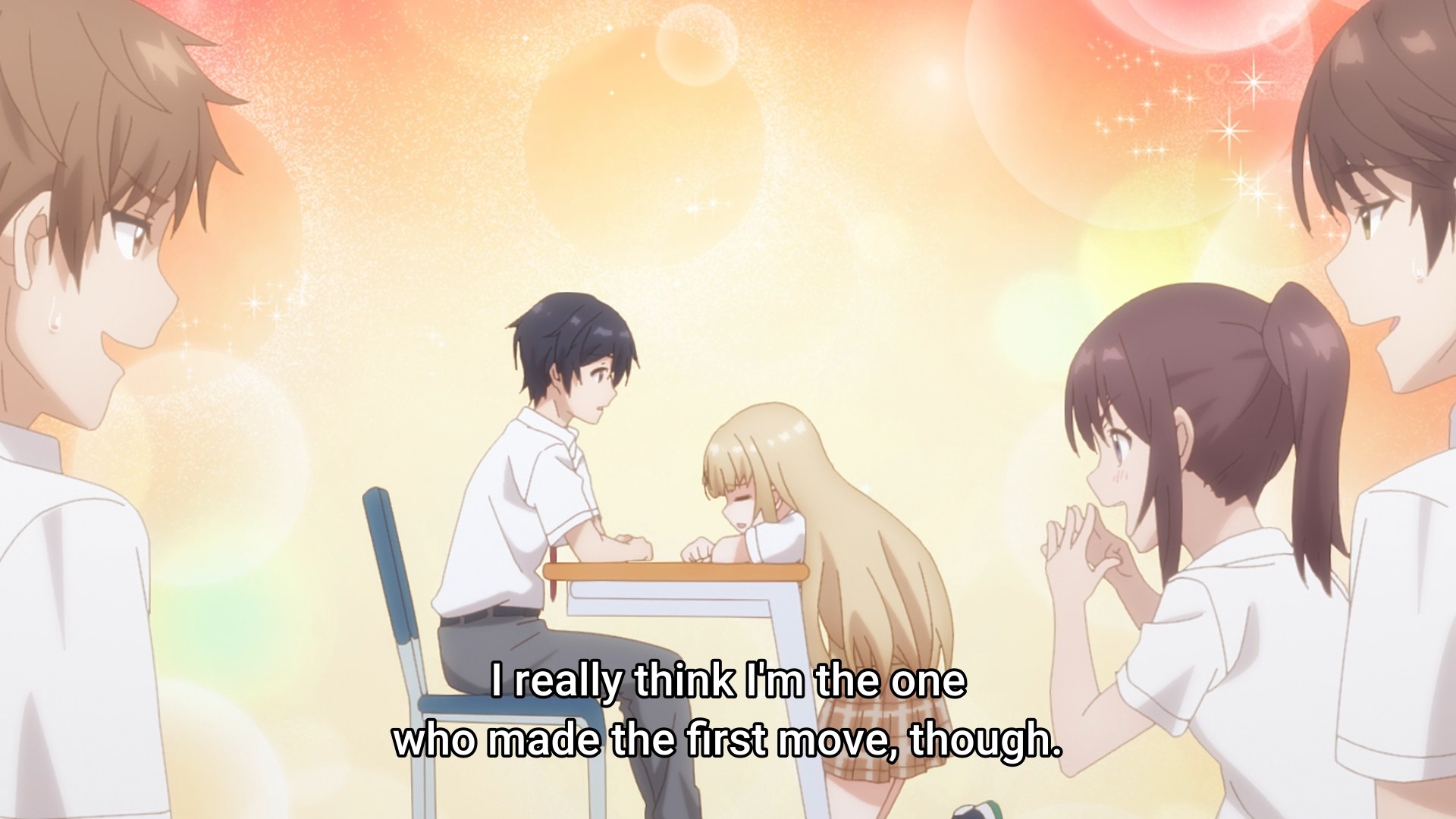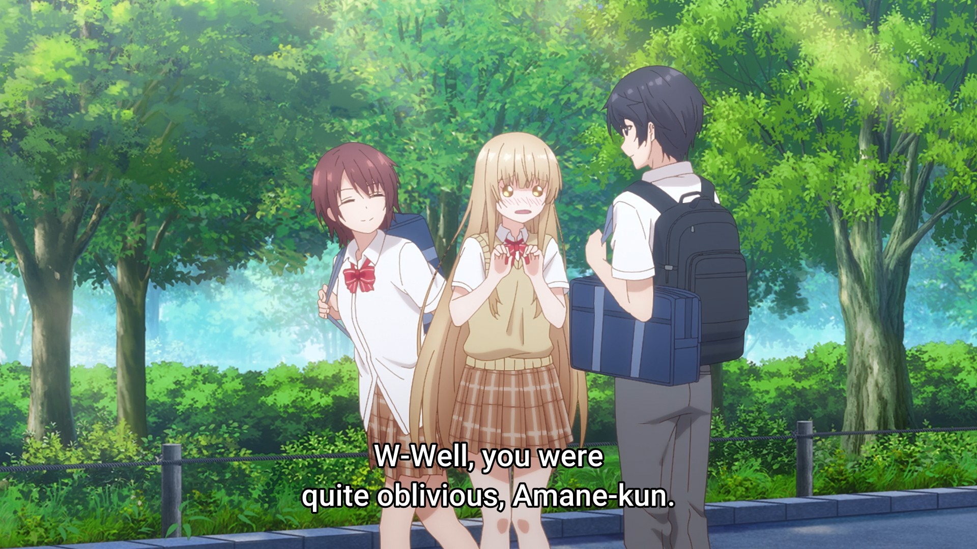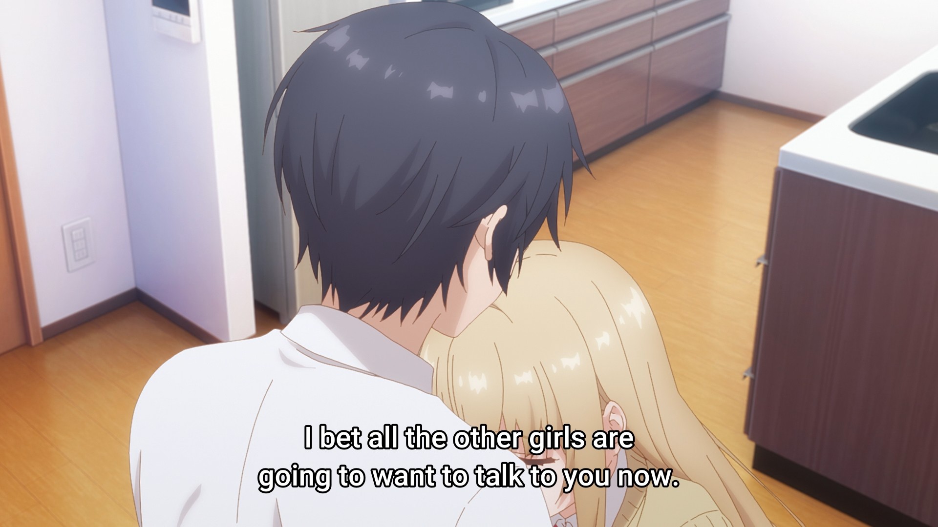 When I finished the first season, I remember coming away from it thinking that the relationship at the heart of the show was rather cloying. Well, the second season sure hasn’t betrayed that thought. The two kids start the sequel off by talking about their relationship. Then they wake up in the morning and talk about their relationship. They walk to school and talk about their relationship. They meet their friend, who of course has to congratulate them on their relationship. They sit in class and talk about their relationship. At lunch, they eat with their classmates and talk about their relationship. On their way home from school, they talk about their relationship. They go shopping for dinner and talk about their relationship. The next day, they still talk about their relationship. From the very first second of the episode to the very last second of the episode, they talk about their relationship. Holy shit, give it a fucking rest. You can still have lovey-dovey moments, but jeez, tone it back a little. You can enjoy each other’s company without constantly talking about yourselves.