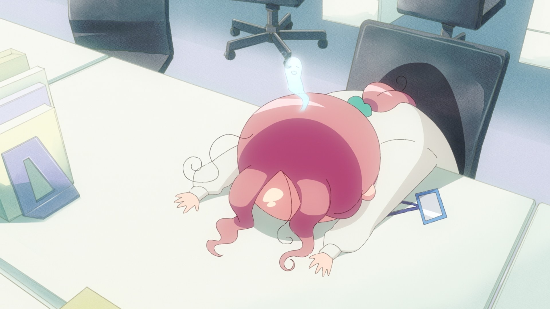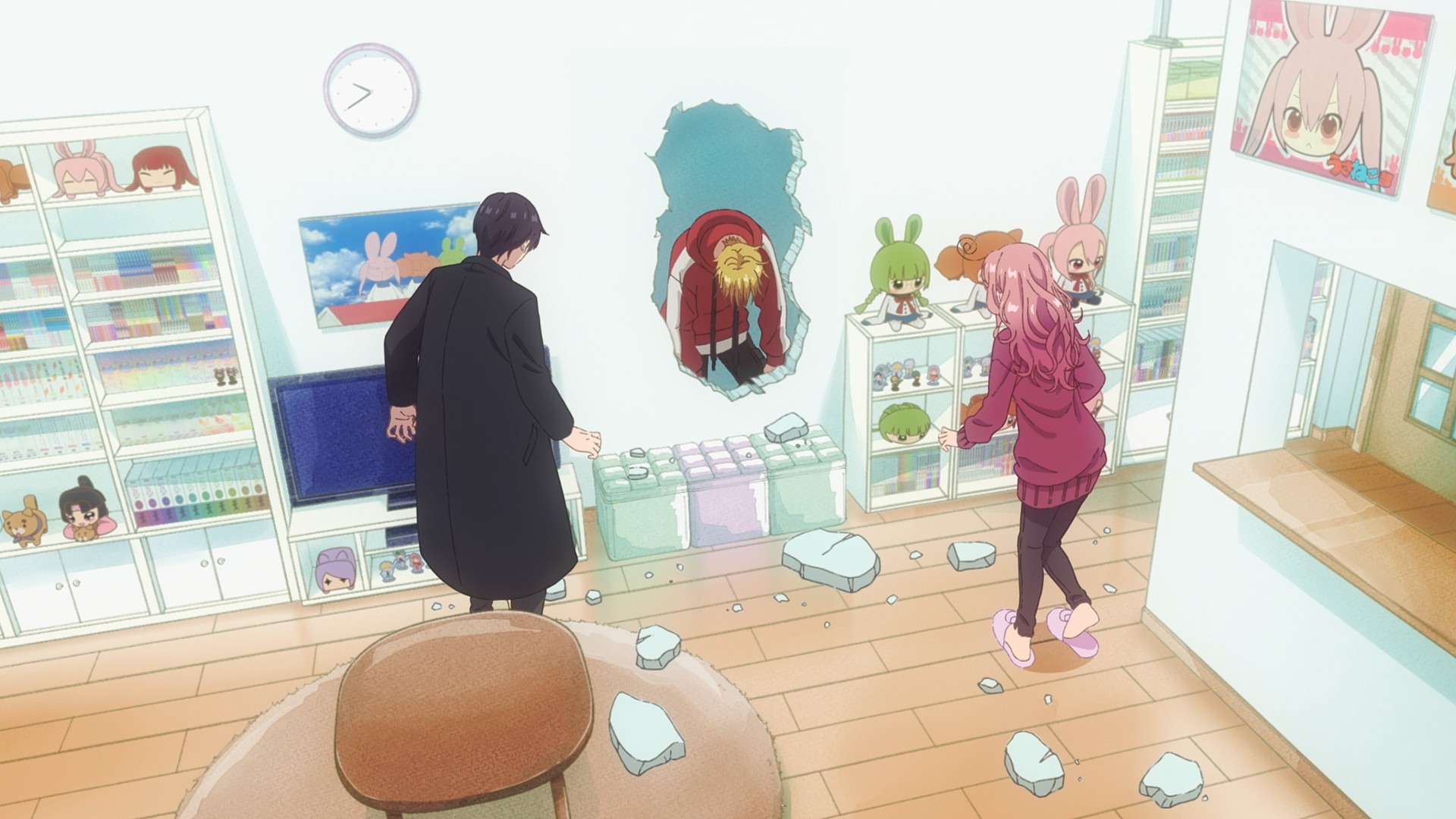 First up, we have Pardon the Intrusion, I’m Home! Rinko Nakama, a young office worker, has built a shrine to her favorite anime series out of her own home. She loves anime so much that if she doesn’t get enough of it the previous night, she’ll become a zombie at work. Lately, however, one of her neighbors will rudely slam on the wall if she watches anything other than Bunny and Cat Club, an in-universe show starring… well, a bunny and a cat. So… just wear headphones for the time being? Move your TV to the other side of the room? Complain to the apartment manager about your belligerent neighbor? Nah, all of those choices are too sensible. All of those choices are too adult for this adult working woman.
