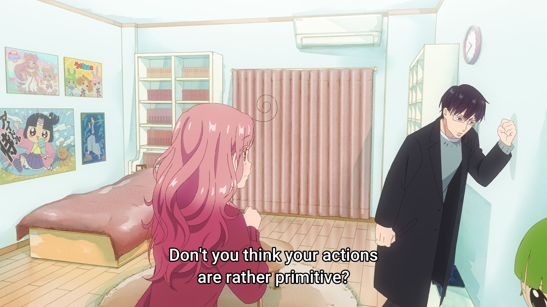 So instead, Rinko mopes around until she catches the notice of Akito, her other neighbor. Akito is a kind, bespectacled young man. Not only does he check up on her, he brings her tea and is even willing to confront the jackass next door. But this is where the show jumps the shark and loses me. I know, I know, it’s just the first episode, but get a load of this. The rude neighbor is such an asshole that he literally destroys the wall separating his apartment from Rinko’s. Time to get him arrested for property damage, right? At the very least, he needs to get his ass evicted. But no, Rinko quickly identifies the asshole as none other than Haruma Usada, the creator of her favorite anime series. In that case, we can’t get him in trouble! What about my animayz?! Also, that broken wall is coming out of her security deposit.