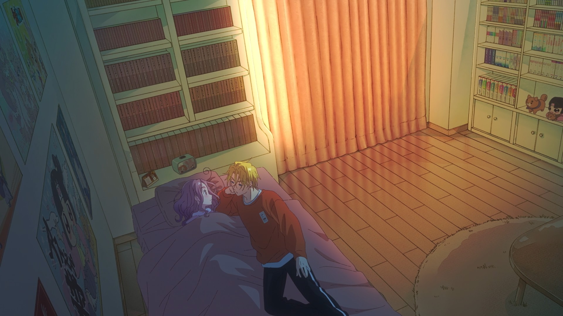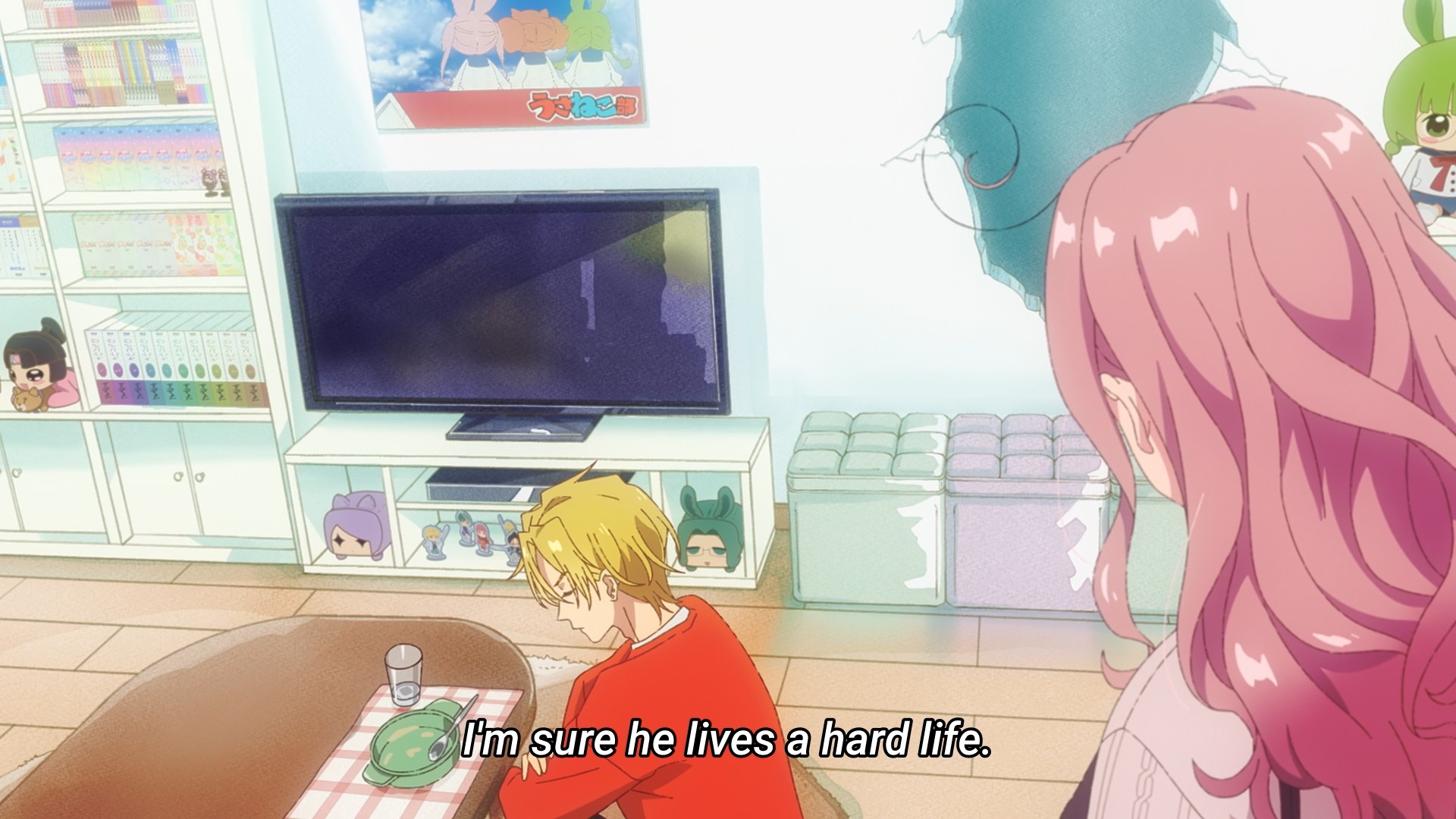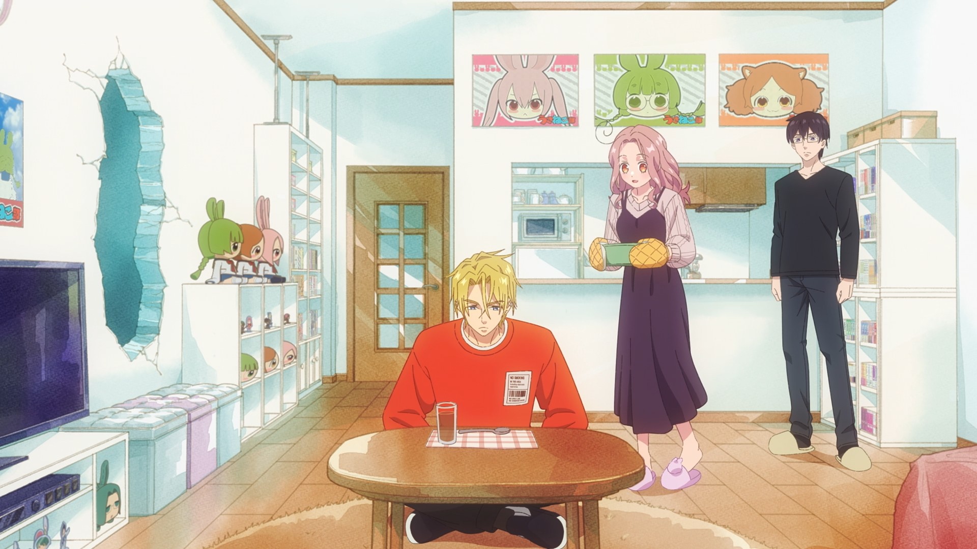 So begins the whacky relationship between these three neighbors! So whacky that Rinko wakes up one day to find Haruma in her bed, demanding that she wake up and make him food… which she happily obliges. Aw, boo hoo, grown ass man is so busy that he has no time to feed himself. Come on, be for real. You can’t seriously tolerate someone this pathetic just because they make your favorite anime (then again, Harry Potter…). Haruma then proceeds to pass out in Rinko’s apartment. Is this ragebait? Is this honestly ragebait? Don’t tell me this is supposed to be a love comedy between a nice but kinda boring dude and a complete and utter loser? Why is this even a choice? You don’t have to pick the boring guy, but definitely don’t pick the guy violent enough to destroy a wall! Two walls, actually, ’cause god forbid Rinko watch other shows in someone else’s home. I side-eye people who merely throw their controllers during a rough gaming session, much less destroy a wall. Either they’re in complete control and they choose to be violent, or they have lapses of self-control, which is just as scary. Those broken walls could be Rinko’s face one day. Welp, so much for putting the adult in working adult.