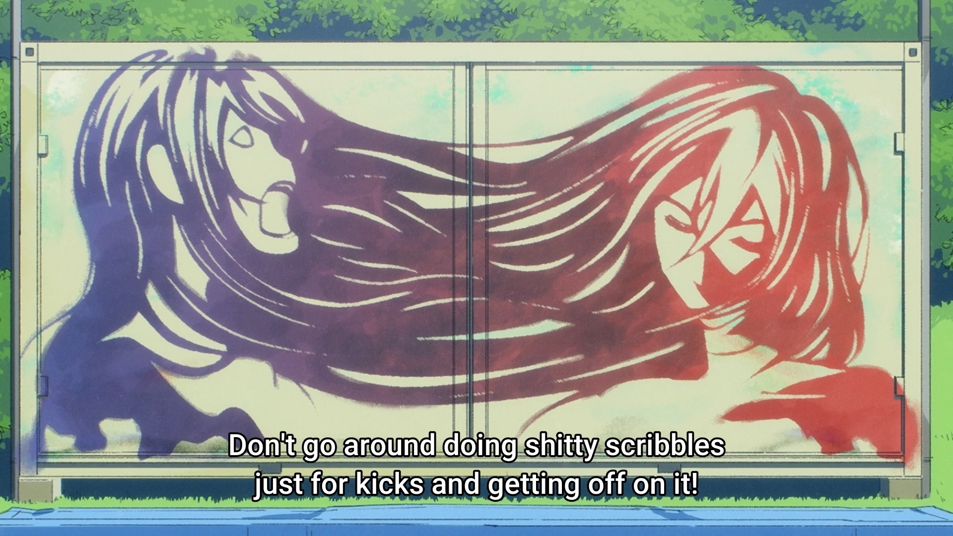 This all changes when Koichi encounters a piece of graffiti art that utterly blows his mind. All of a sudden, he wants to aim high. He wants to make a name of himself one day. Well, the graffiti was done by the left-handed Eren, hence the title. And she seems… rather volatile. She’s extremely talented, but she’s not even shooting for the middle like Koichi. She completely rejects her mother’s idea of going to art school. When she yells at Koichi that only a select few will ever make it big, it sounds like she’s trying to convince herself to put her own foolish ambitions to rest. Okay, fine, but what does that have to do with Koichi? Why does she go and slap him across the face for drawing a mural she doesn’t like? Why does she give a fuck what he wants to do with his life? Is it her job to gatekeep the art in her neighborhood? I mean, she literally does the “gatekeeping” meme: “How many [designers] can you name?” Oh yeah, you want to be an artist?! Name literally every artist out there! You can’t? Then you’re just a poser! But seriously, this all seems very silly to me.