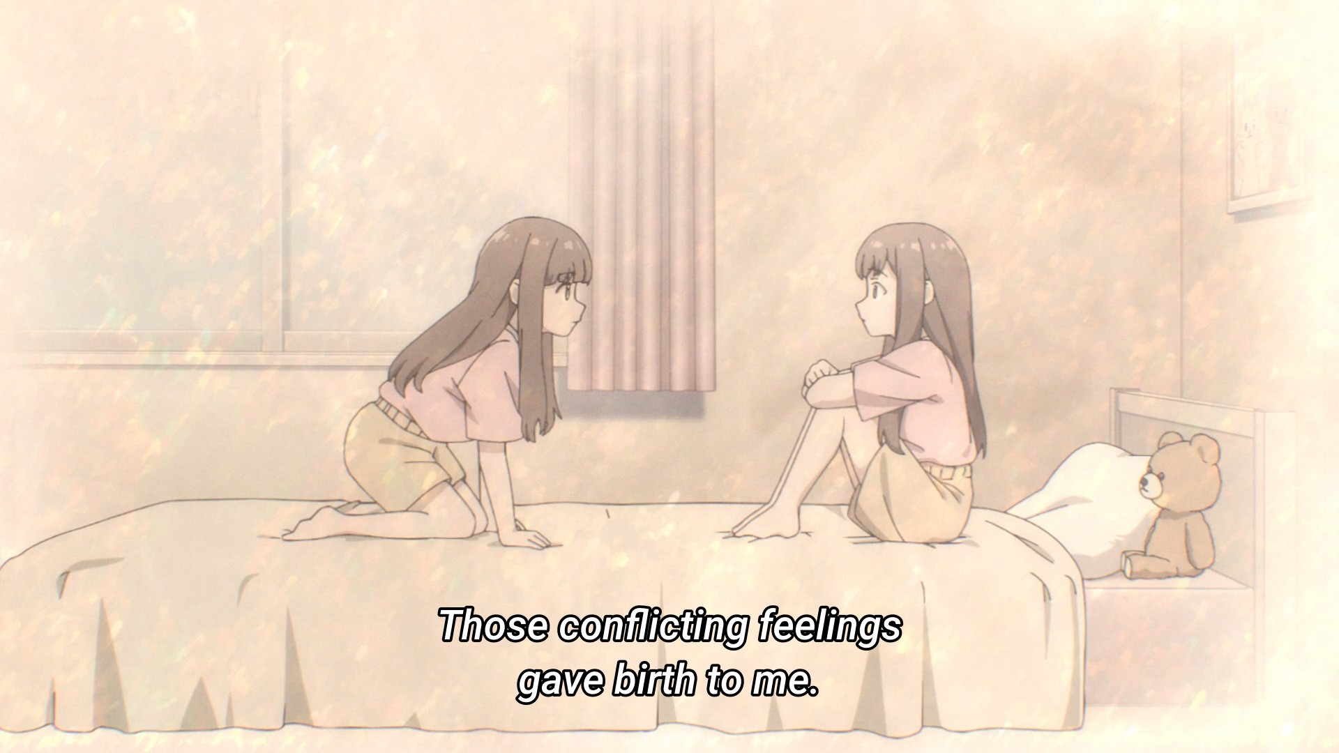 You could argue that we shouldn’t take any of this too literally. Rather, this is a girl with deep-seated issues, so she feels the need to disconnect from her own life. This has many benefits like, for instance, avoiding responsibility. Nao only came into existence because Sunao simply didn’t want to apologize to her friend. Overtime, this ability has become a crutch. The girl feels the ever increasing need to take less risks as she continues to distance herself from the world around her. Through her replica, Sunao can rebuild or maintain her current relationships without investing too much of herself. If she fucks up, well, it’s not really her fault. Blame it on the replica. Even if Nao feels bad, who cares? That’s her problem to handle, not Sunao’s. I’m reminded of the lady “severing” herself in Severance in order to avoid dealing with the pain of carrying a pregnancy to term. This anime isn’t quite as mindfucky as that show, but you can see how it could potentially explore similar themes.