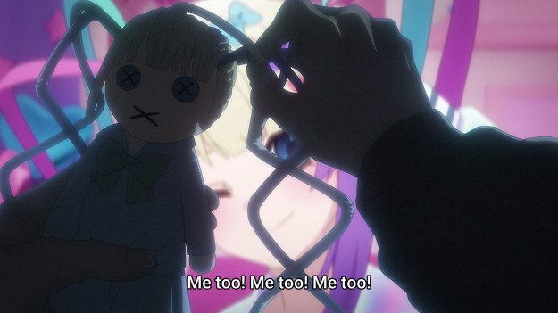 Near the end of the episode, the disheveled, crazy woman finally makes it onstage to confront KAngel. What did KAngel actually do to her? Does it even matter? Does the woman even actually look like this? Or is this just our image of what a crazy person should look like? But even her dagger isn’t straight. She has no conviction. KAngel then stops her swing by directly grabbing the blade, not even caring that she just cut herself. She needs to get back to her producer, so it’s almost as if she doesn’t even notice the woman. She barely reacts to her. It’s one of those “who’s actually the crazy one” moments. But we don’t even know if the producer exists. It’s easy to assume that the person behind the streamer is the normal one, but Ame’s just as crazy. Maybe her mania for her producer is what propels KAngel to metamorphose and streams every night. Ame ends the episode by reaffirming her love for her producer. Someone must be filming this. But again, the person on the other side of the camera could just be us.