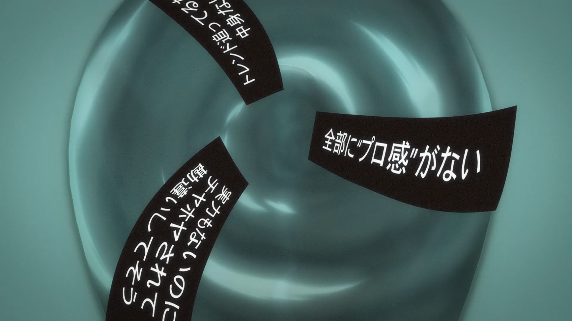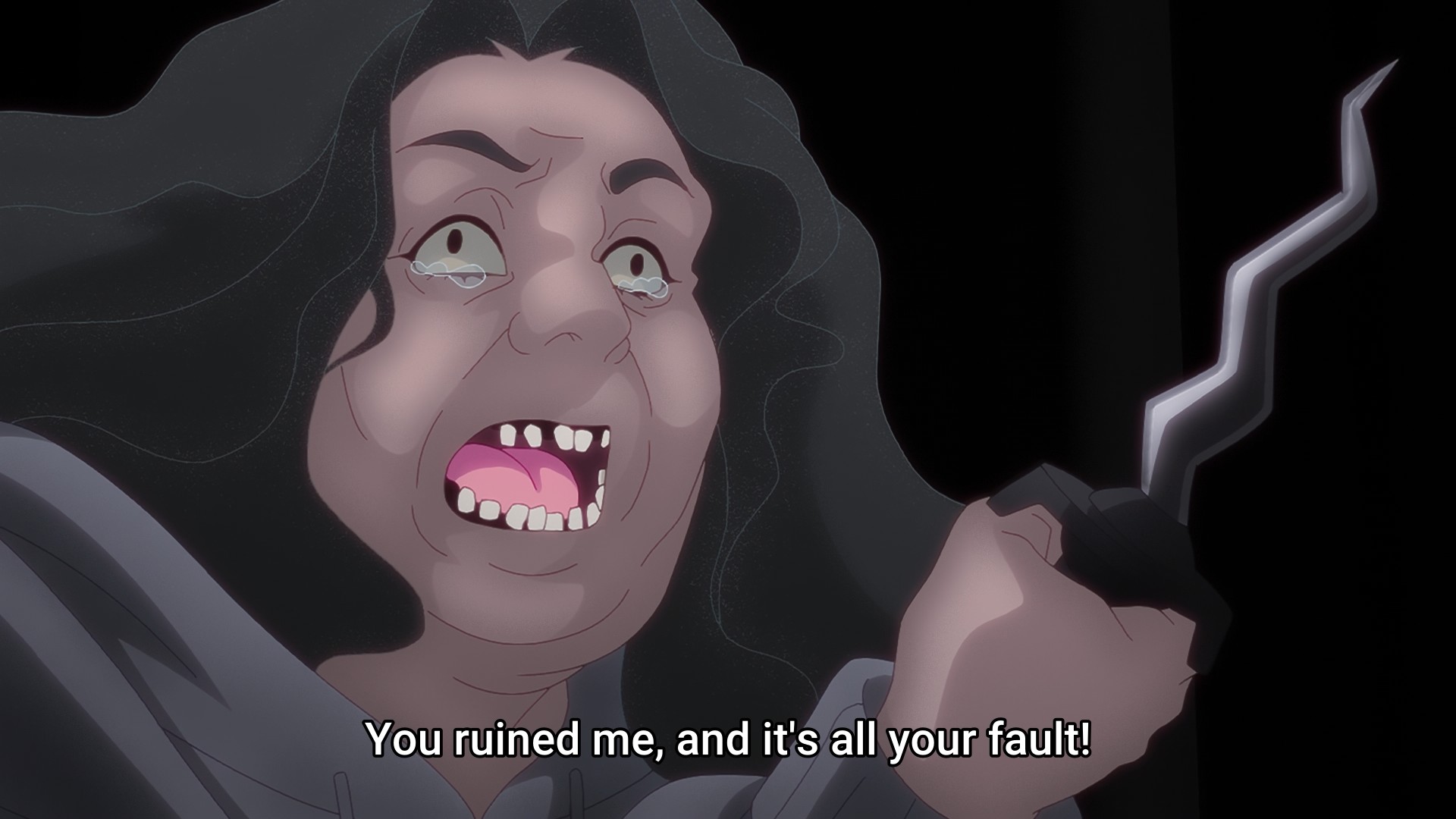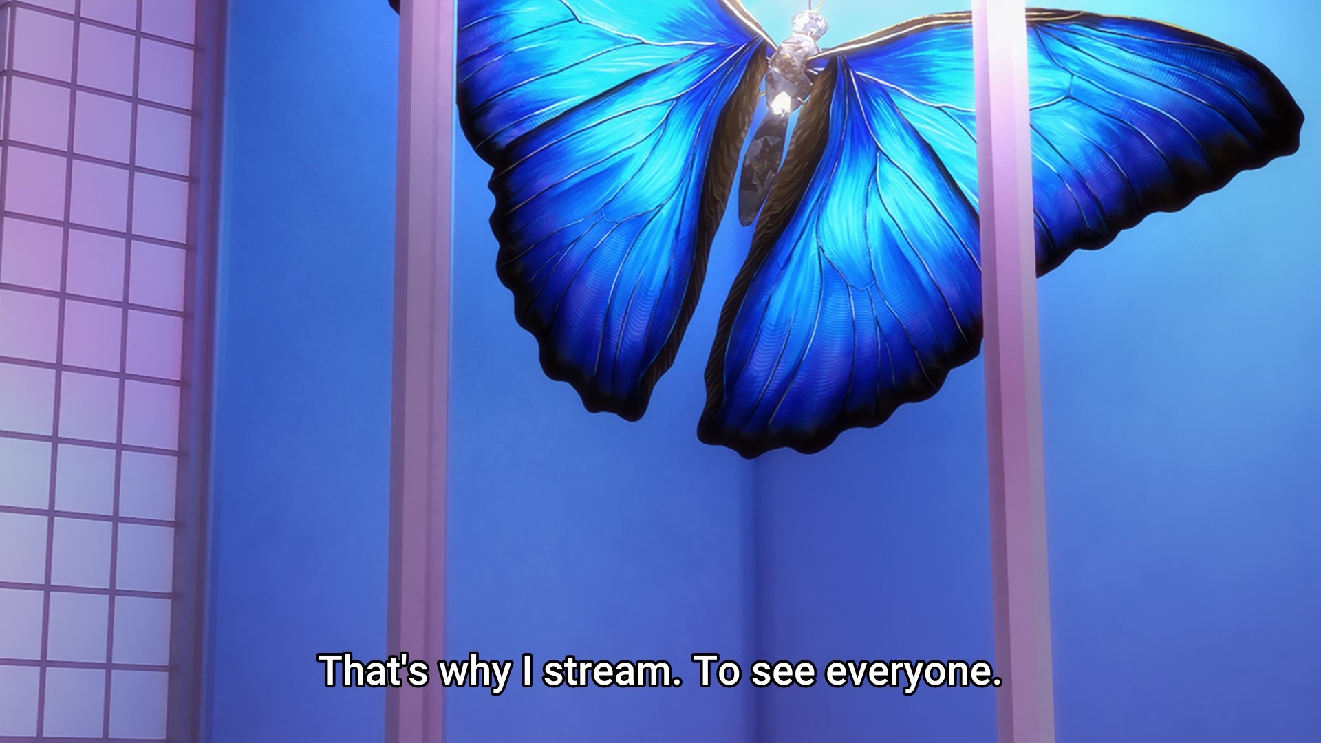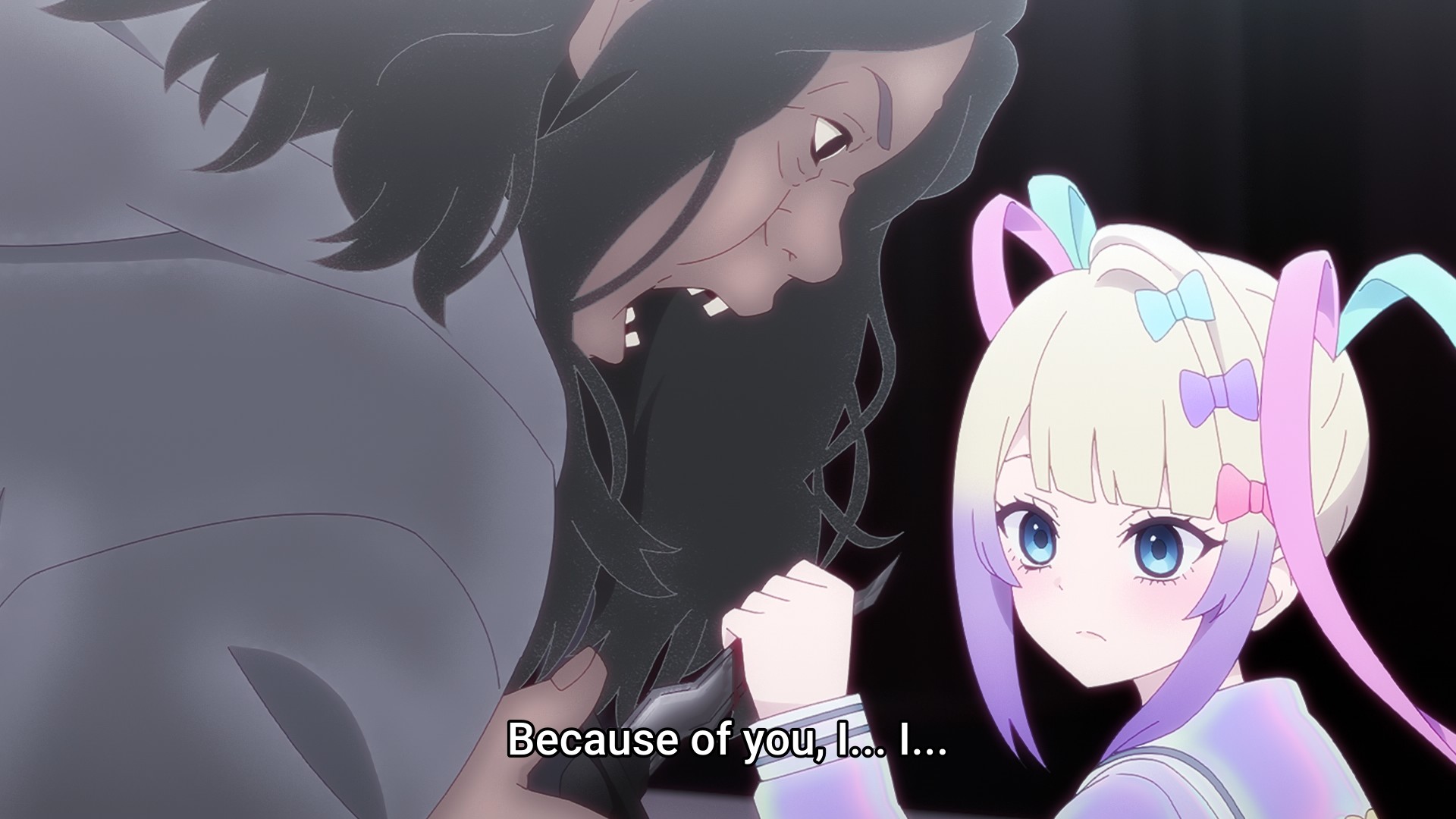 Near the end of the episode, the disheveled, crazy woman finally makes it onstage to confront KAngel. What did KAngel actually do to her? Does it even matter? Does the woman even actually look like this? Or is this just our image of what a crazy person should look like? But even her dagger isn’t straight. She has no conviction. KAngel then stops her swing by directly grabbing the blade, not even caring that she just cut herself. She needs to get back to her producer, so it’s almost as if she doesn’t even notice the woman. She barely reacts to her. It’s one of those “who’s actually the crazy one” moments. But we don’t even know if the producer exists. It’s easy to assume that the person behind the streamer is the normal one, but Ame’s just as crazy. Maybe her mania for her producer is what propels KAngel to metamorphose and streams every night. Ame ends the episode by reaffirming her love for her producer. Someone must be filming this. But again, the person on the other side of the camera could just be us.