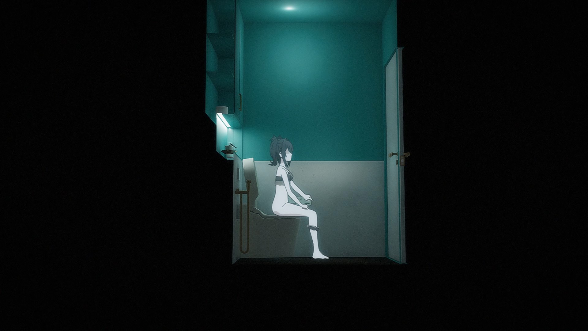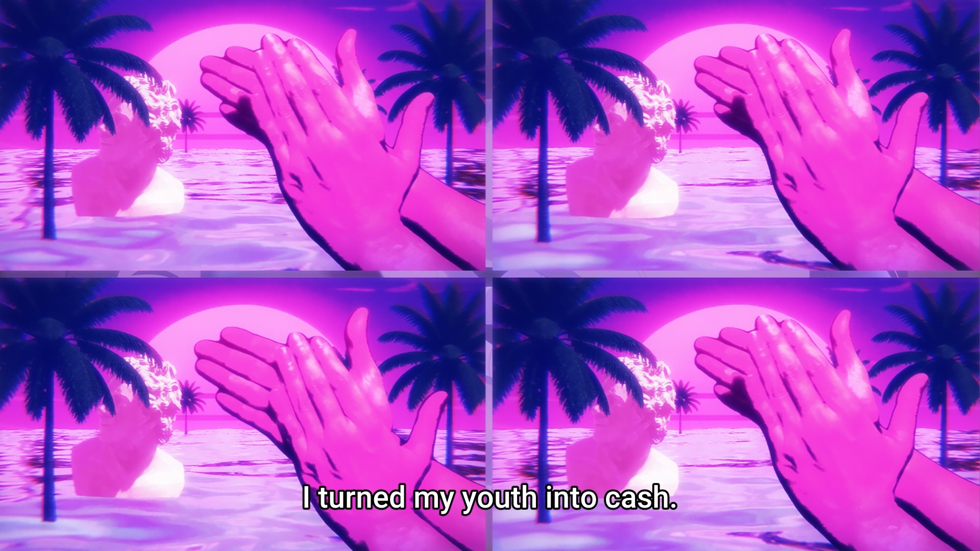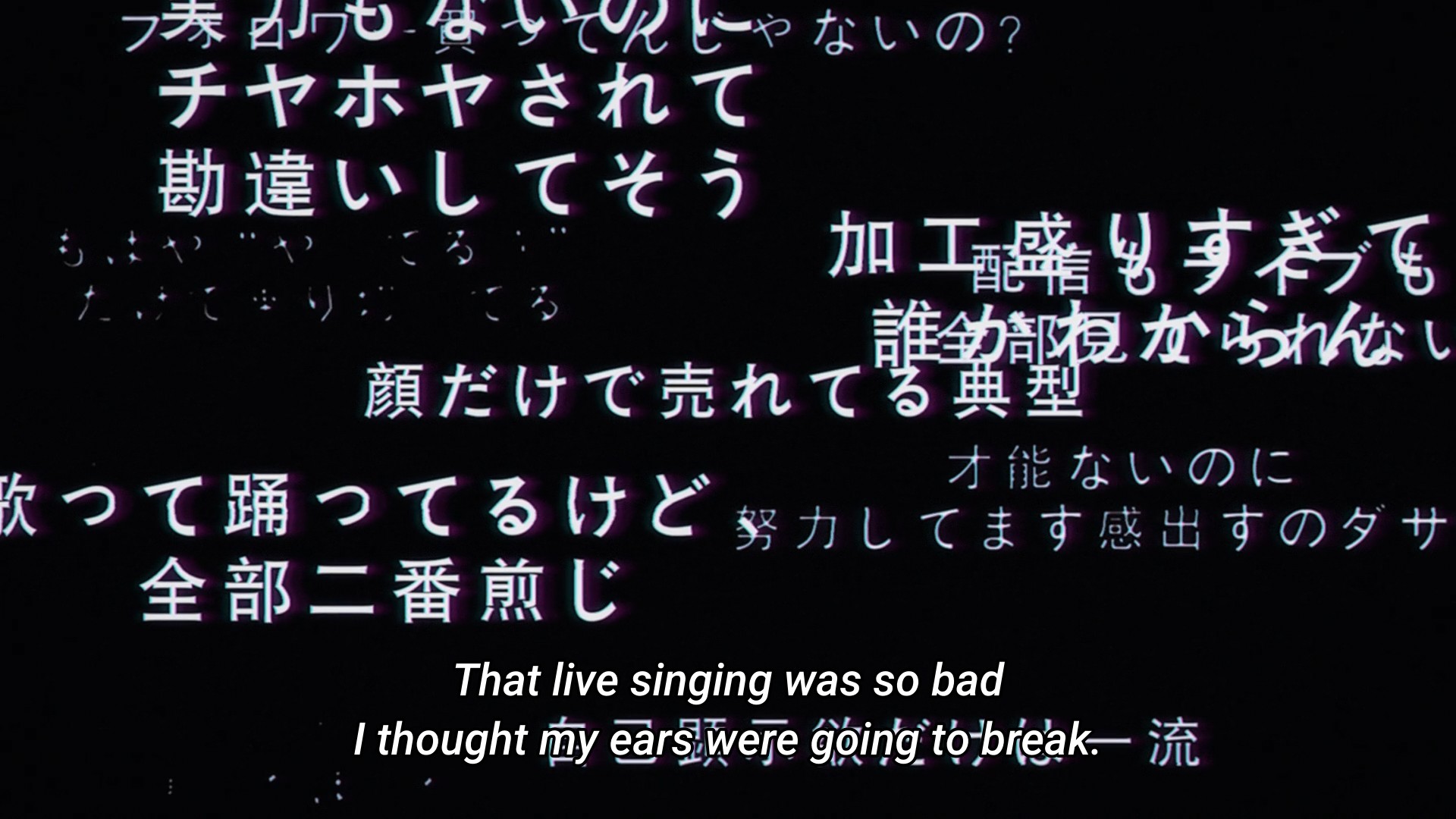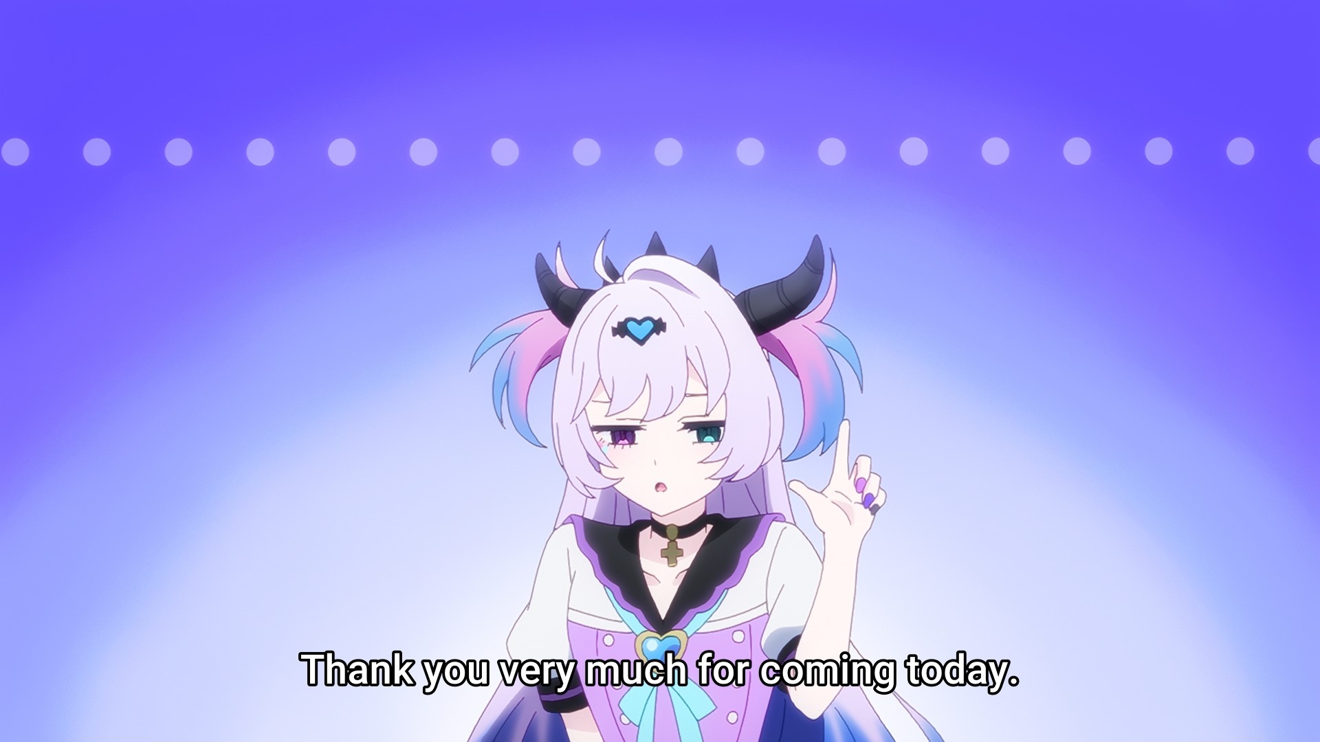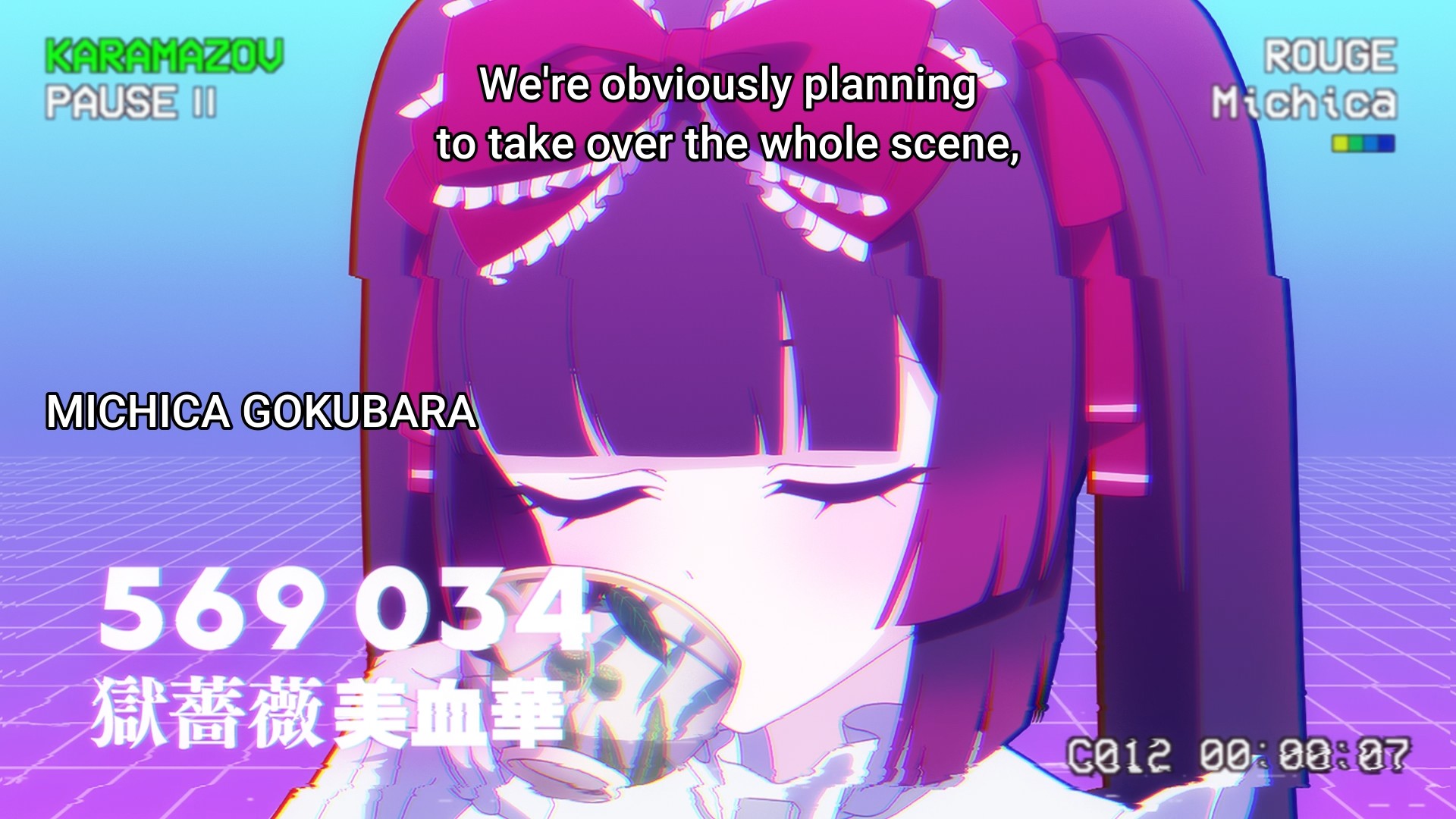 Near the end of the episode, the disheveled, crazy woman finally makes it onstage to confront KAngel. What did KAngel actually do to her? Does it even matter? Does the woman even actually look like this? Or is this just our image of what a crazy person should look like? But even her dagger isn’t straight. She has no conviction. KAngel then stops her swing by directly grabbing the blade, not even caring that she just cut herself. She needs to get back to her producer, so it’s almost as if she doesn’t even notice the woman. She barely reacts to her. It’s one of those “who’s actually the crazy one” moments. But we don’t even know if the producer exists. It’s easy to assume that the person behind the streamer is the normal one, but Ame’s just as crazy. Maybe her mania for her producer is what propels KAngel to metamorphose and streams every night. Ame ends the episode by reaffirming her love for her producer. Someone must be filming this. But again, the person on the other side of the camera could just be us.