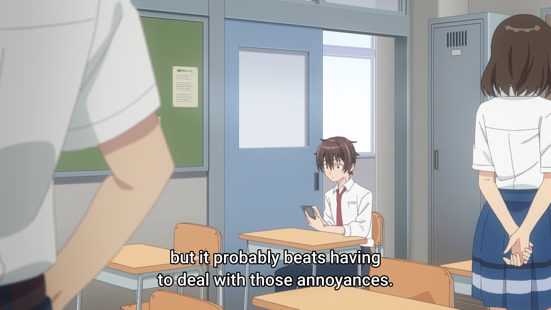 The next day, Yuu apologizes to Maki, then says she would like to speak to him some more. She then accidentally blurts out that he has her number. As a result, all of the guys in class start glaring at Maki. Again, this what I’m talking about. In reality, most people seriously wouldn’t give a shit. Maybe one or two dorks might get jealous, but most people are too busy with their own lives to care. You really want to convince me that 90% of the guys in class are not only listening in, they would get also mad? Nah, man. Get out more. Go touch some grass. So why are we seeing this? Is this gonna be one of those shows where the main character can secretly flex about getting to know all the hot girls? Well, that’s just how it is in some anime. The plain Jane, shy girl befriends the hottest, most popular guy in school who just happens to have no interest in anyone until she comes along. Same thing here. Umi is shooting down guys left and right because she’s just sooooo hot and popular. But she only wants to hang out with her nerdy gamer friend! We only care about what’s on the inside, after all! By the way, have we mentioned just how hot she is? Second most, actually! It’s literally in the title! But jokes aside, that’s why it’s such a breath of fresh air when a show comes along and doesn’t even mention the characters’ attractiveness. Unfortunately, this anime has been very bog standard so far.