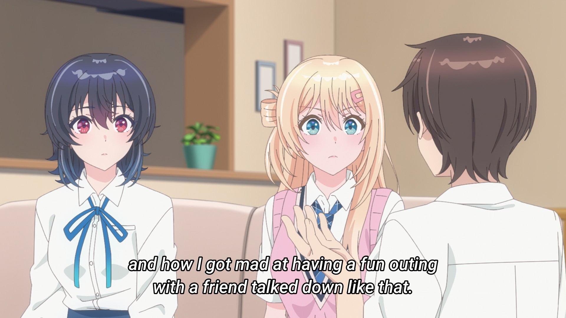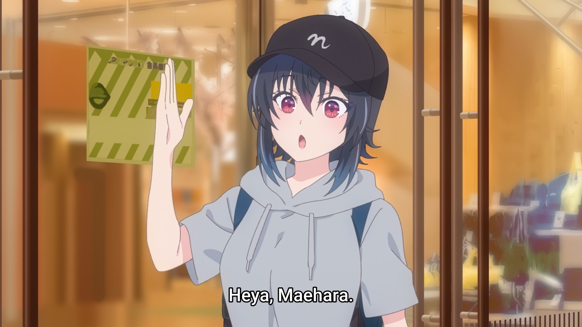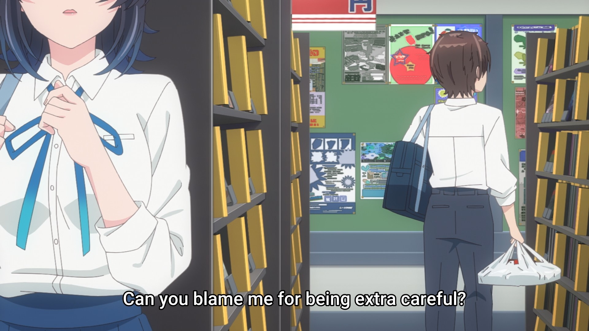 Friday eventually arrives, which means it’s time for Maki and Umi to go on their totally-not-a-date date. His “DESTROY” shirt is certainly a choice, but at least it’s not another fanny pack strapped across the chest. Meanwhile, Umi is dressed like a Marvel superhero trying to go incognito. But hey, maybe she’s just that popular. Sure enough, some random girls think they’ve spotted her when the couple takes a break for lunch (shoulda kept her hat on). But the girls take it back after thinking about it some more. After all, there’s just no way she could date a dweeb instead of the hot guy! I don’t really like it when shows do this. By this, I mean make every other character shallow and shitty. You and I Are Polar Opposites isn’t the gold standard, but when random girls go up to Suzuki to ask about Tani, they aren’t judgmental. They don’t start shit-talking Tani. They just want to know the deets. But in other shows, the NPCs always feel like they only exist to prop the main characters up. They’re only there to make the main characters seem saintly by comparison.
