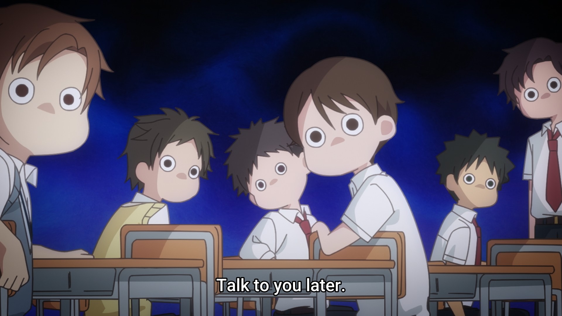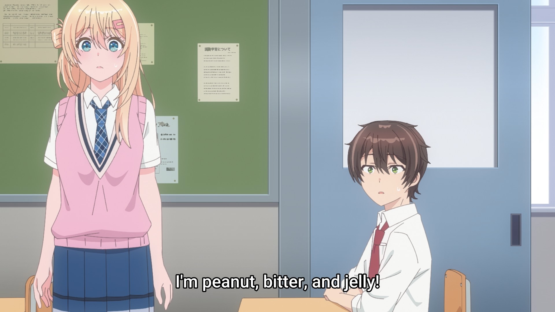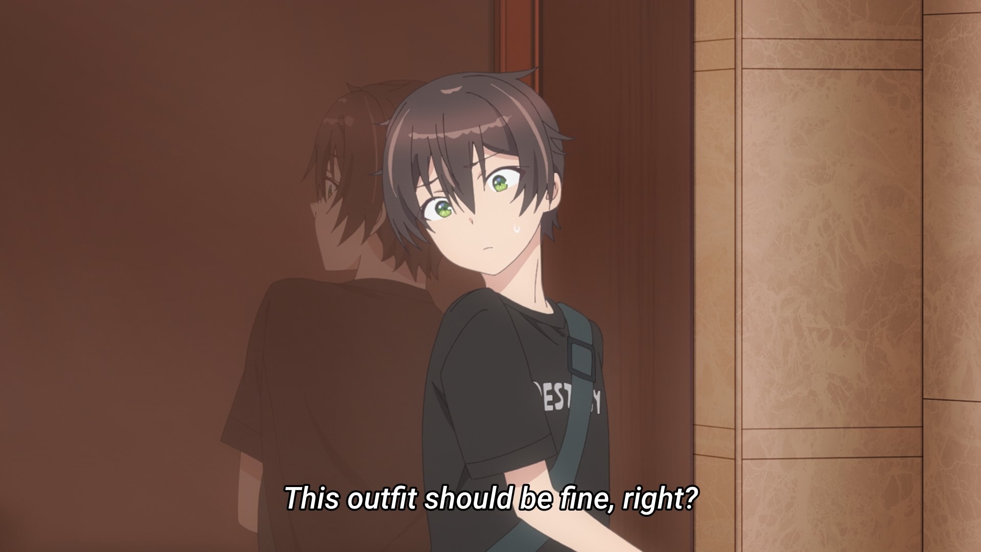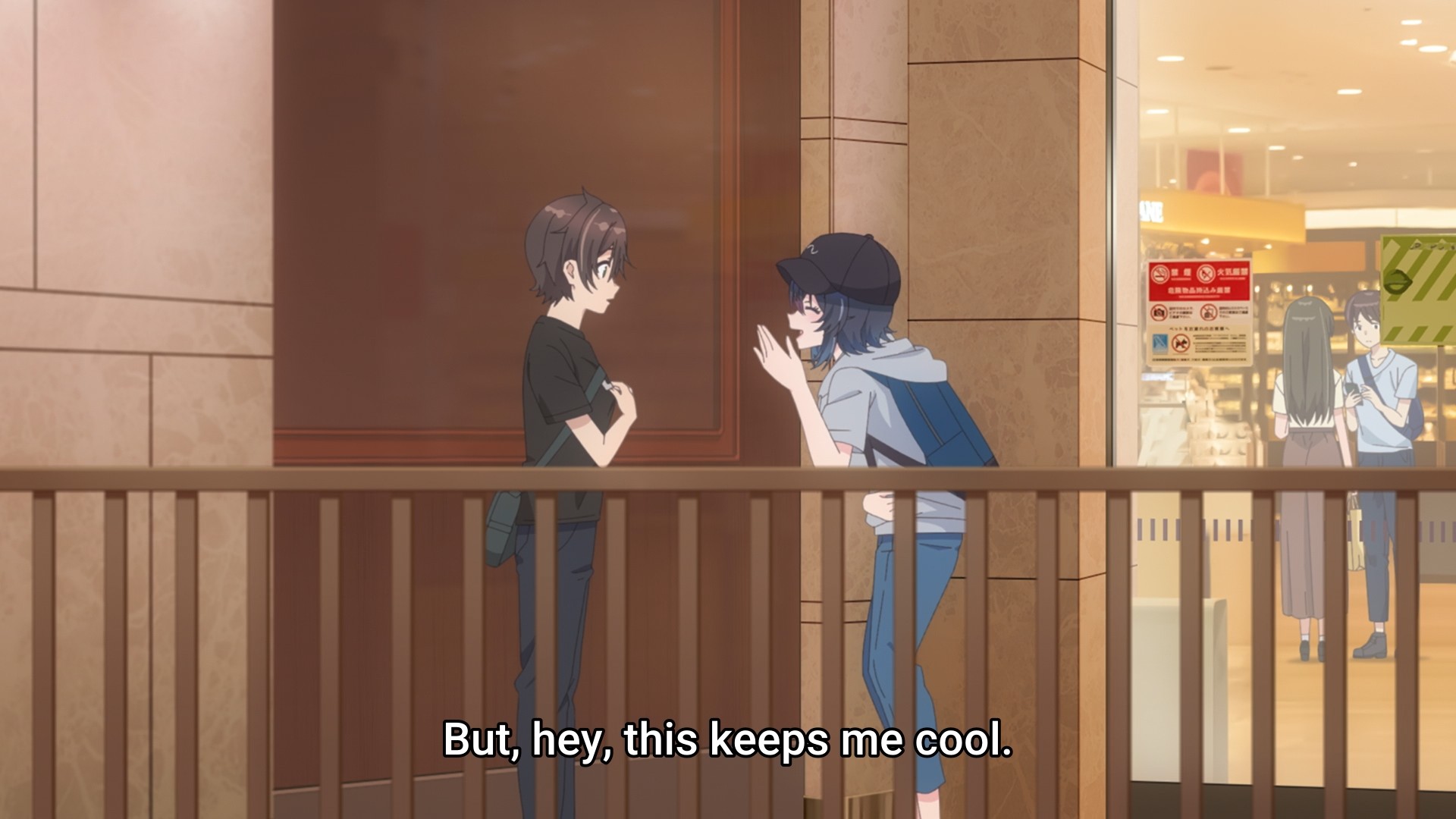 Friday eventually arrives, which means it’s time for Maki and Umi to go on their totally-not-a-date date. His “DESTROY” shirt is certainly a choice, but at least it’s not another fanny pack strapped across the chest. Meanwhile, Umi is dressed like a Marvel superhero trying to go incognito. But hey, maybe she’s just that popular. Sure enough, some random girls think they’ve spotted her when the couple takes a break for lunch (shoulda kept her hat on). But the girls take it back after thinking about it some more. After all, there’s just no way she could date a dweeb instead of the hot guy! I don’t really like it when shows do this. By this, I mean make every other character shallow and shitty. You and I Are Polar Opposites isn’t the gold standard, but when random girls go up to Suzuki to ask about Tani, they aren’t judgmental. They don’t start shit-talking Tani. They just want to know the deets. But in other shows, the NPCs always feel like they only exist to prop the main characters up. They’re only there to make the main characters seem saintly by comparison.