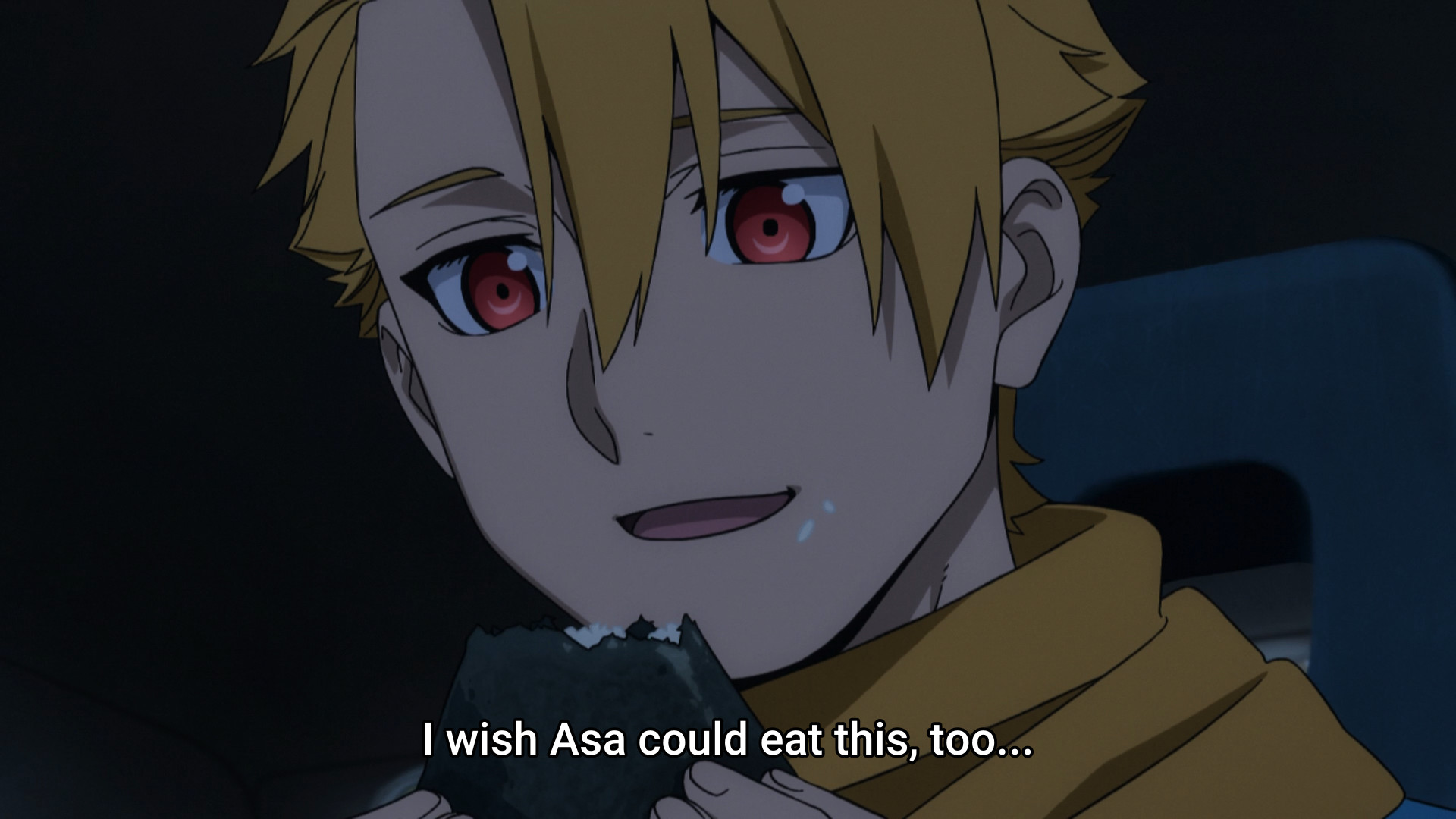 — Imagine seeing and feeling plastic for the first time. And oh yeah, all white rice. But Dera and Hana could’ve taken Yuru into the rest stop to eat. Instead, he’s stuck in the car with the two Daemons, eating cold ass onigiri. At first, I understood Dera and Hana’s position; they probably don’t want the kid to have a sensory overload. Hot food full of seasonings he’s never encountered, a crowd of people sitting and eating in one room, bright lights everywhere, etc. But after finishing the episode and seeing how well Yuru takes everything in, he probably would’ve handled his first restaurant just fine.