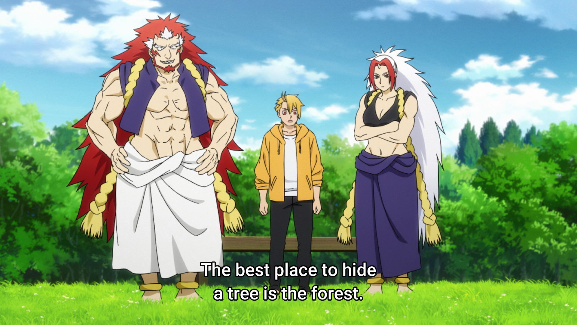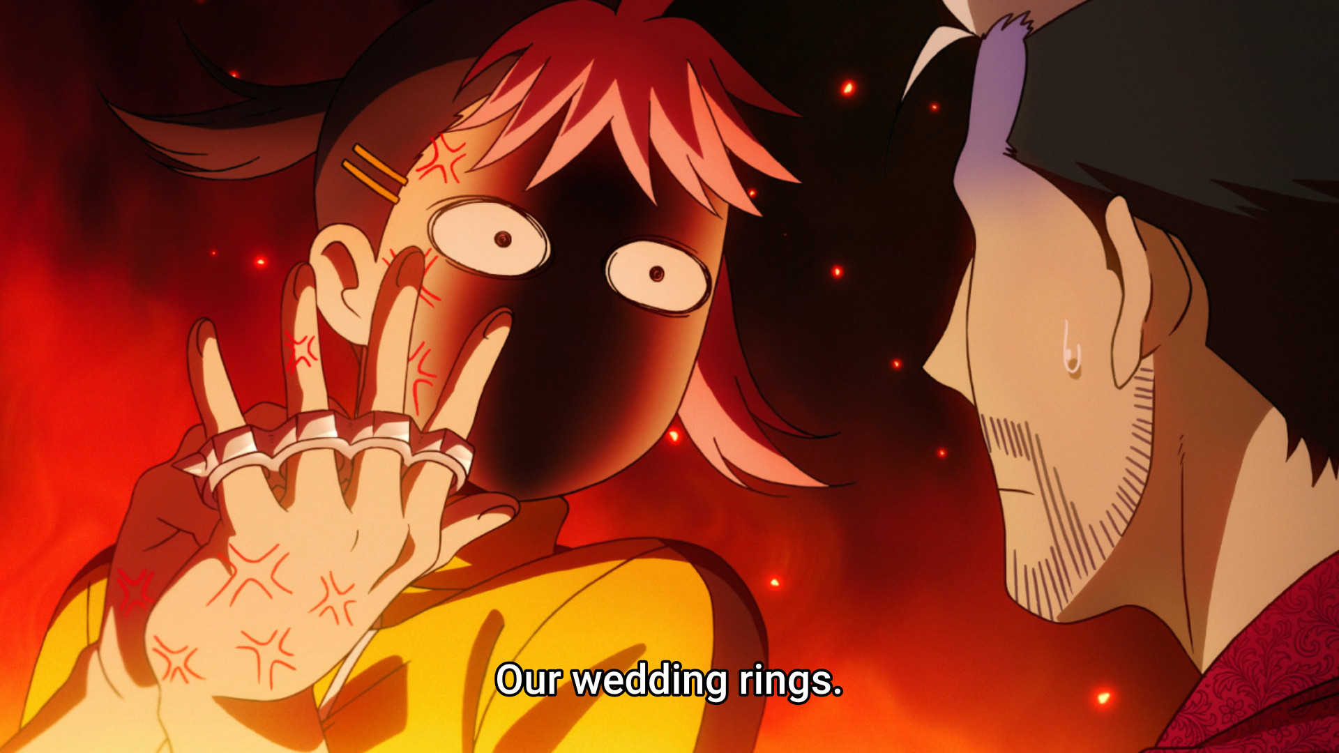 Dera and Hana reveal that they’re retainers for the village. How do you even get saddled with such a responsibility? Through inheritance, apparently. You gotta respect the clan’s rules, because… because what? ‘Cause your ancestors told you so? I can’t imagine it, especially in this day and age. And now Hana is expected to play along and pretend to be Dera’s wife. Rather than deal with potentially salacious rumors, Dera thinks it would be better if they got fake married. So… she just gives up on her normal day-to-day routine? What if she’s in a relationship? She has to give that up too? Man, I would quit. Fuck the clan’s rules.