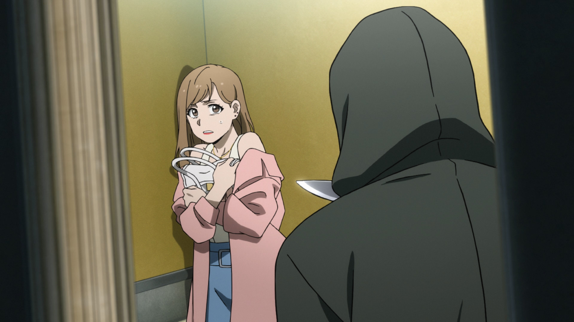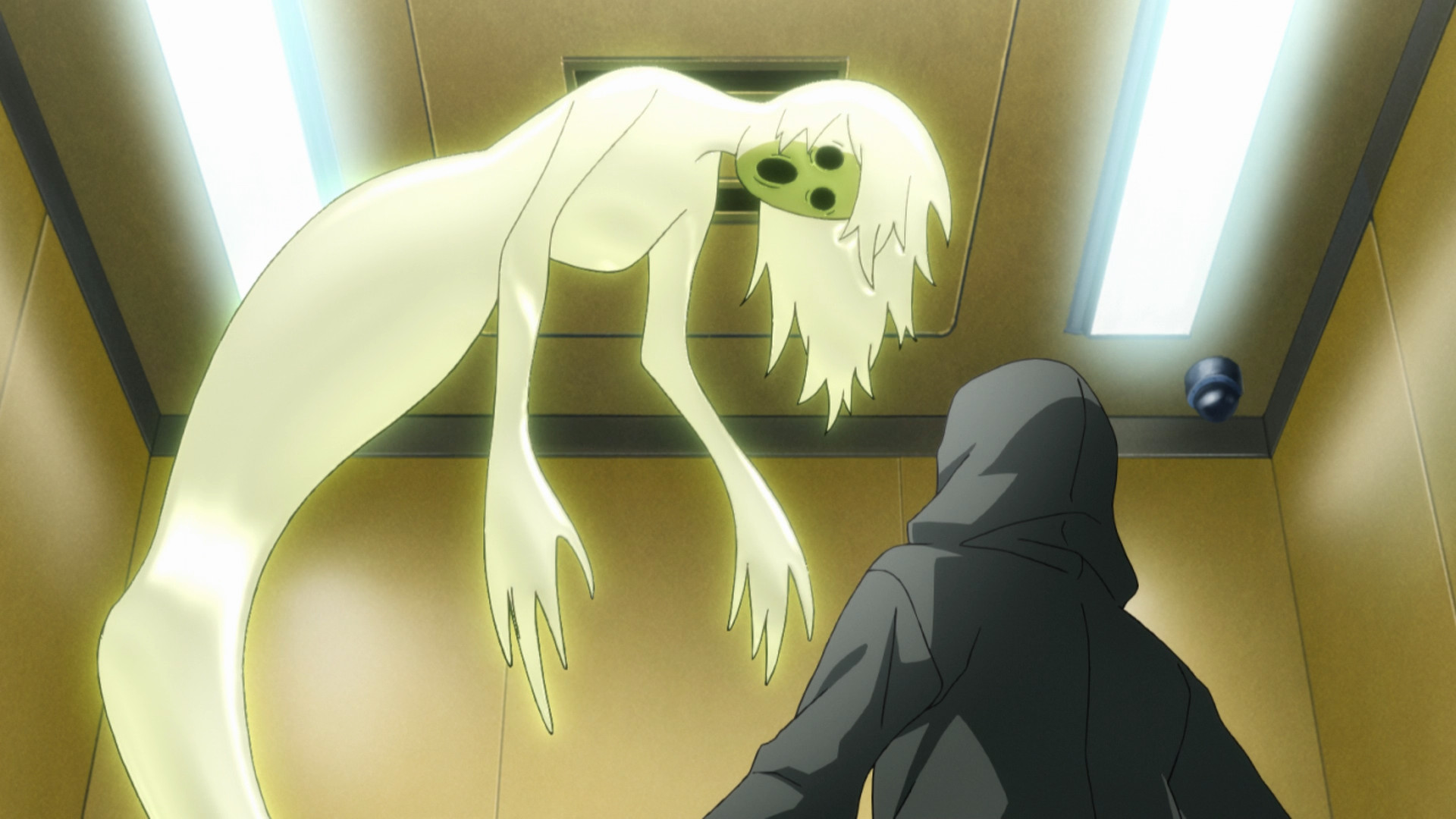 — At one point, we cut to a woman being cornered by a stalker in the elevator? But that’s no woman! It’s actually an anglerfish with a human-shaped lure. That Kagemori guy’s side hustle is handling stalker cases, apparently, so he has his Daemon lure these bastards in. Such an oddly specific job with an oddly specific Daemon, though. Like I get why this scene exists. Let’s show us what this Kagemori guy is capable of! But still, such a random cut.