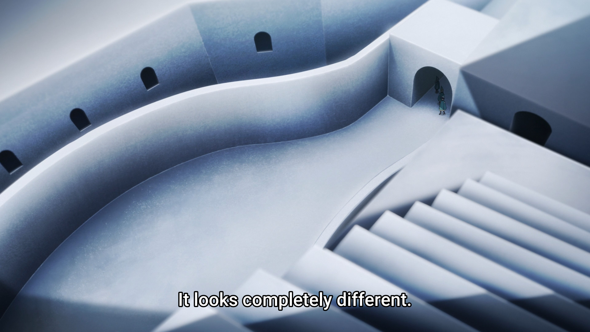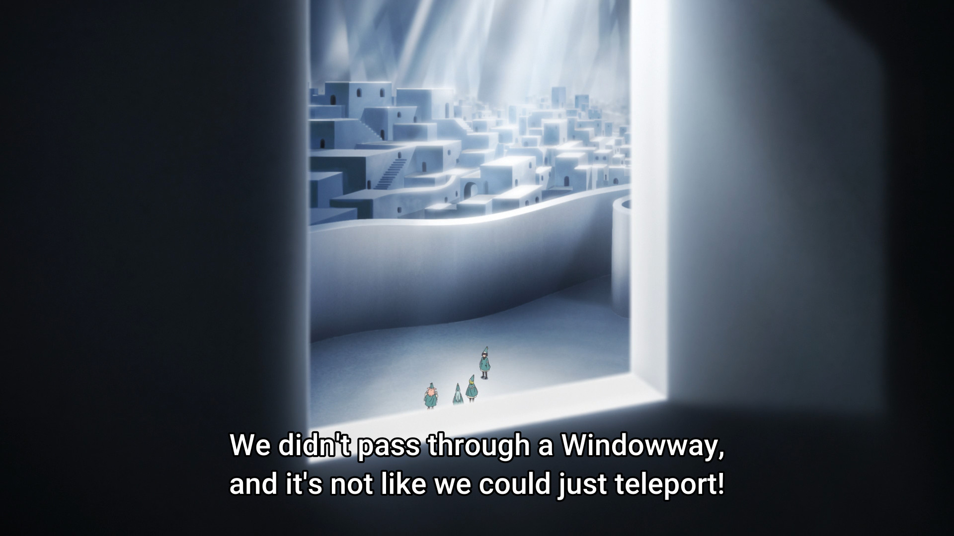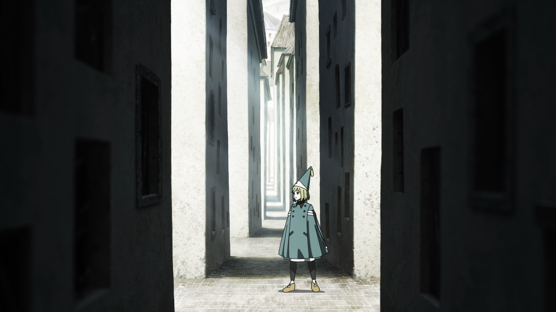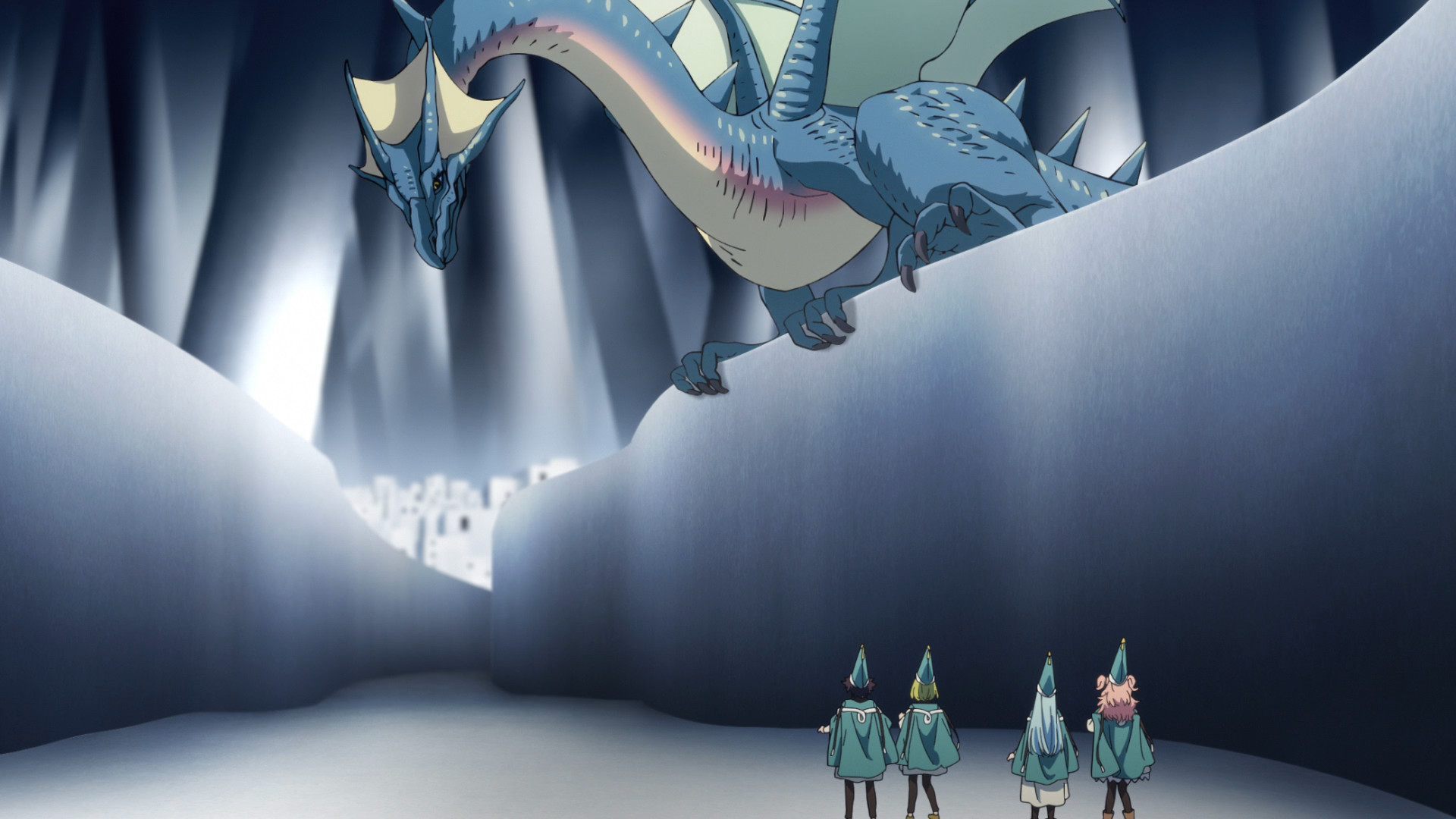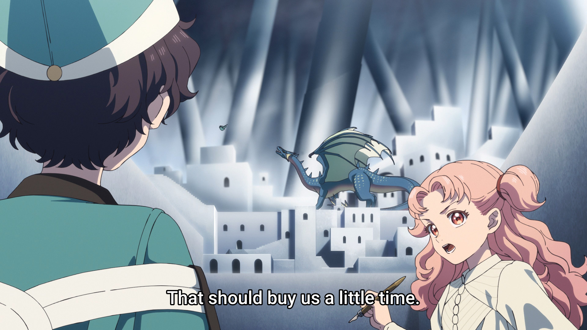 The Brimmed Cap leads Coco on a wild goose chase through several conspicuously empty alleyways. Before the kids realize it, they have been transported to another location with stark white walls and unfamiliar architecture. Yep, this ain’t Kansas Kalhn anymore. And then a dragon shows up. Y’know, just for good measure. Clearly, the kids — more specifically Coco — are being tested, and if they get eaten, then so be it. A mysterious woman — probably the same Brimmed Cap that Coco has been chasing — states matter-of-factly that Coco is their hope. Uh huh. All these years, they have been waiting for someone to use forbidden magic? Did they never think to pay Coco a visit and just show her how to do it? I mean, the anime opened with the kid doing laundry on her own, so it’s not like she was never alone. I’m just sayin’, these Brimmed Caps sure like to play the long game.