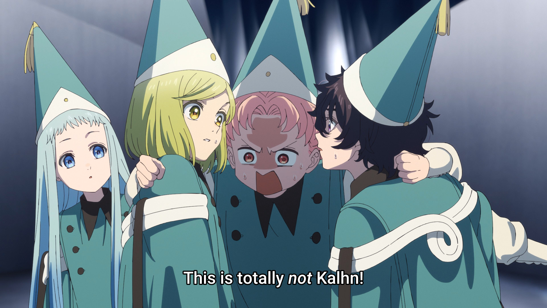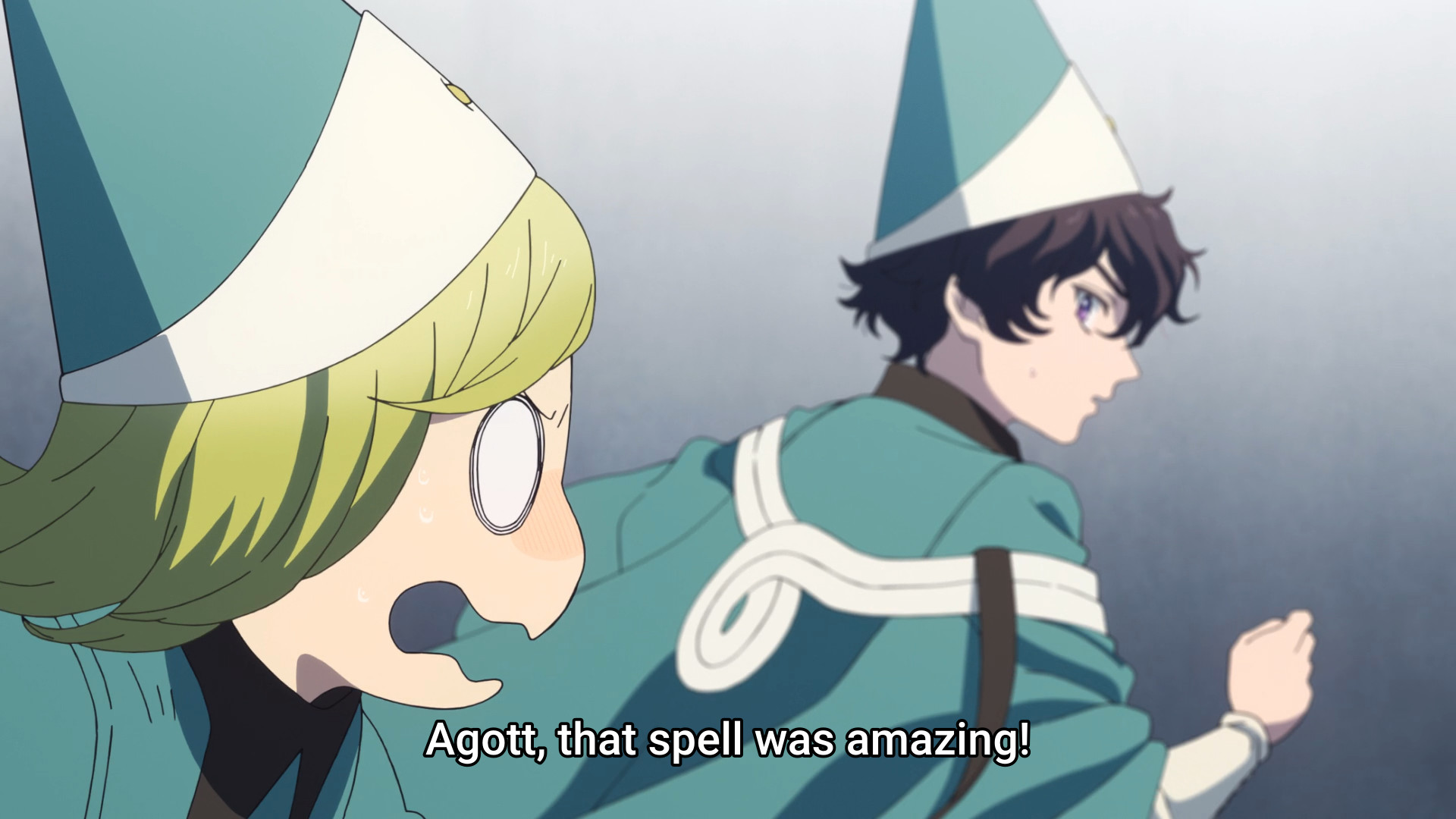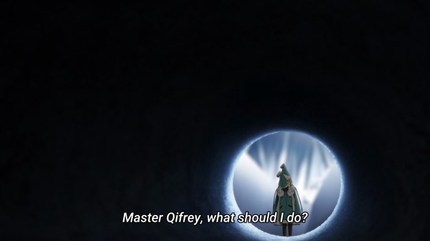 The three trained apprentices start trying to figure out a way to escape. In the meantime, they distract the dragon by making Tetia’s gown float in the wind, which is kind of funny. It’s like the dragon is a dumb cat chasing after a balloon. Meanwhile, Coco can only stand and watch. After all, she still hasn’t picked out a new wand. She assumes that Agott will blame her for getting all four of them into this mess, and her worst fears are quickly confirmed when Agott just unloads on her. Granted, Coco did make her screw up in the middle of drawing a spell. But you know who I truly blame? C’mon, it’s obvious. It’s clear that Qifrey has not spoken to Agott since the whole Dadah Range incident, so the girl’s simmering anger has now boiled over. I’ve never seen a more useless teacher. Can’t keep Agott in line, can’t keep an eye on four kids. All he can do is look cool. Other than that, I have not seen one redeeming quality. He should not be in charge of children.