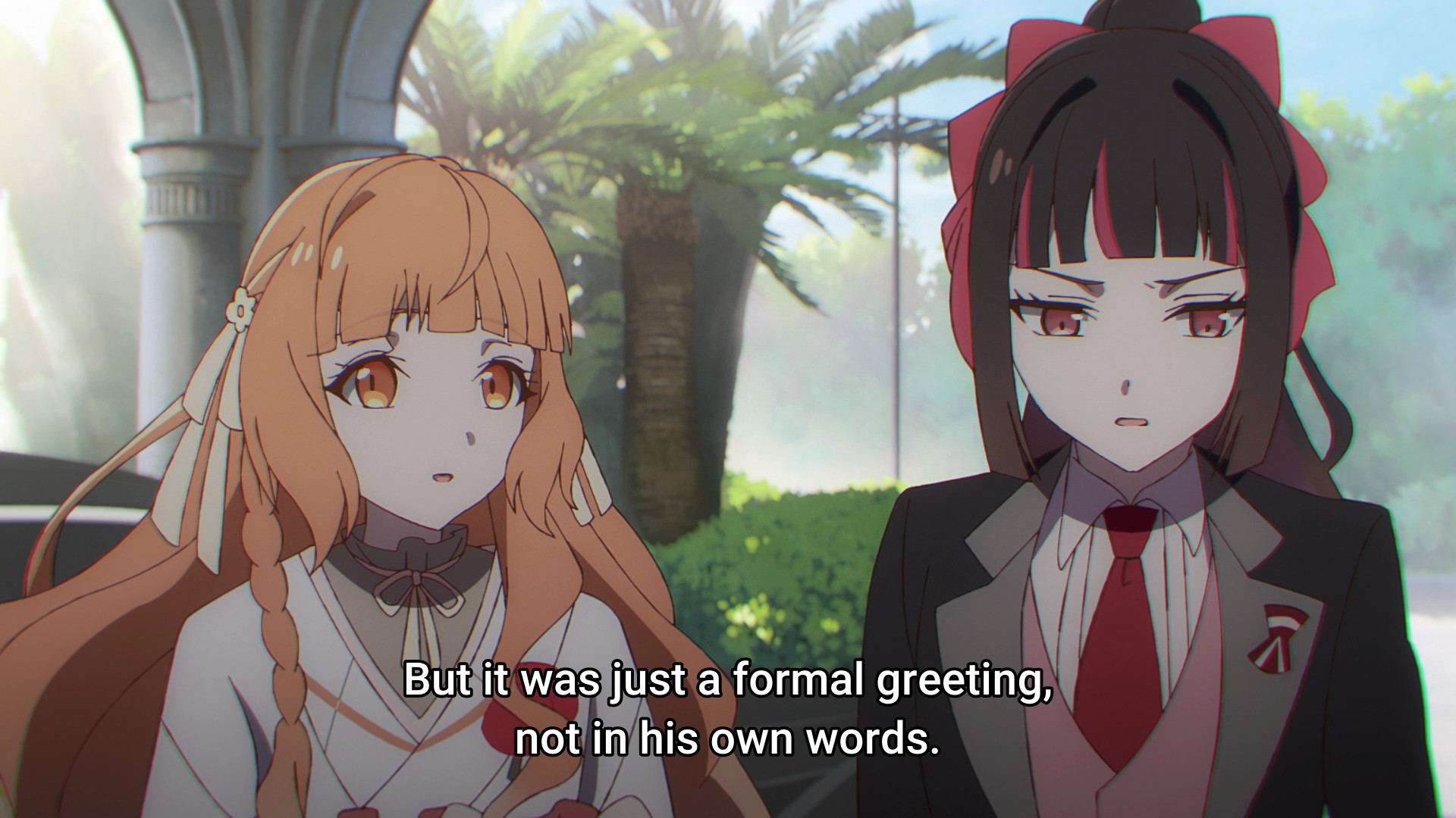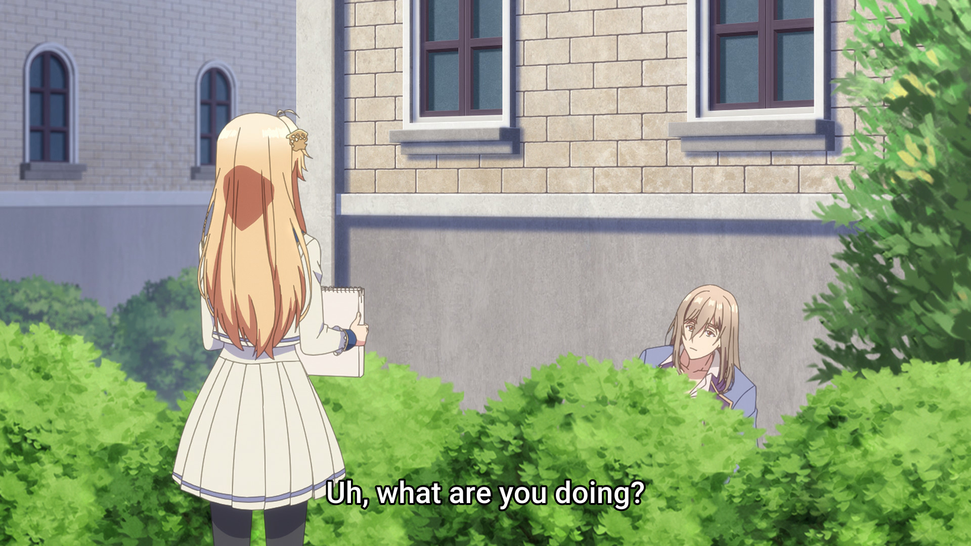 The rest of the episode is unfortunately rather aimless. Maria is supposed to be headed home to see her family, but she still hasn’t done so. There’s a scene where she and her classmates compare art. There’s a scene where she impresses the Chivalric Order with her account on how she saved the queen, so they want her to join her. Did they ever catch whomever was trying to assassinate the queen? Doesn’t seem like it. There’s yet another scene of Ireneo stalking Maria. Again, a man in his 30s hiding in the bushes so he can watch girls in secret. The only seemingly relevant scene is Maria’s father being sexist, which plays into her upcoming trip home. The show’s pacing is simply bad. There are too many wasted moments. If it doesn’t push the story forward, why include it?