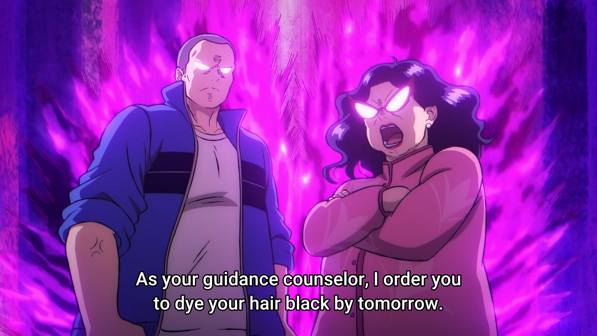 In the second half of the episode, two of the school’s overzealous teachers threaten to shave Hirose’s head, because they don’t believe his light brown hair is natural. Luckily, his teacher comes to the rescue. Unluckily, Hirose starts acting way too inappropriately with Otogiri-sensei, and the man even allows it. Oh yeah, this is what the controversy with the mangaka was all about, huh? Supposedly, they tweeted or retweeted fanart shipping Hirose with Otogiri, and people got up in arms about it. Well, I don’t go around harassing people when they create something I don’t approve of, but I also can’t say that I have any further interest to watch this show. As I’ve said in the past, I’m not interested in this shit. It’s just gross.