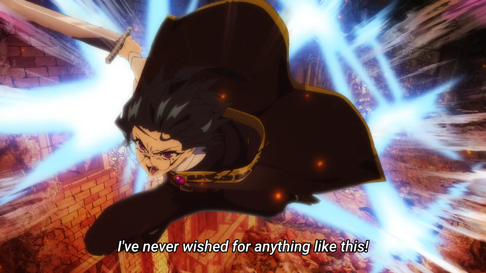 If you’ve watched any action anime before, then you know how it goes: both sides trade blows back and forth until the designated hero gets angry enough to win. So at first, the good guys are stumped, because some of the monsters are armed with magic-nullifying weapons. That’s bad! But Will can still fight with his sword. That’s good! But monsters are swarming all over, and Will can’t cover the entire city. That’s bad! The students realize, however, that they can still hurt the monsters indirectly, i.e. using magic to crash a huge statue into the bad guys. That’s good! But the bad guys summon forth a notorious monster from the 40th floor — notorious because it has killed Magia Vanders before. That’s really bad! But here comes the dwarves, who are super strong! That’s really good! So the bad guys unveil a trick: the notorious monster can absorb other monsters to become super strong! That’s really, really bad! So how do we continue upping the ante? Will looks like he’s outmatched. Rosti tries to empower him, but loses an arm before he can get the spell off. This pisses Will off slightly, but not enough. You know someone has to die. That’s how Goku went SSJ, so Will must go through the same steps. In other words, it isn’t enough to lose an arm. Rosti has to lose his entire life!