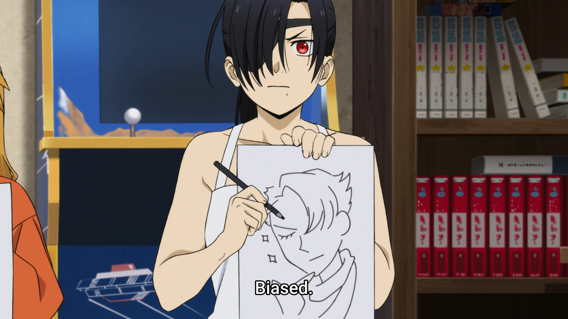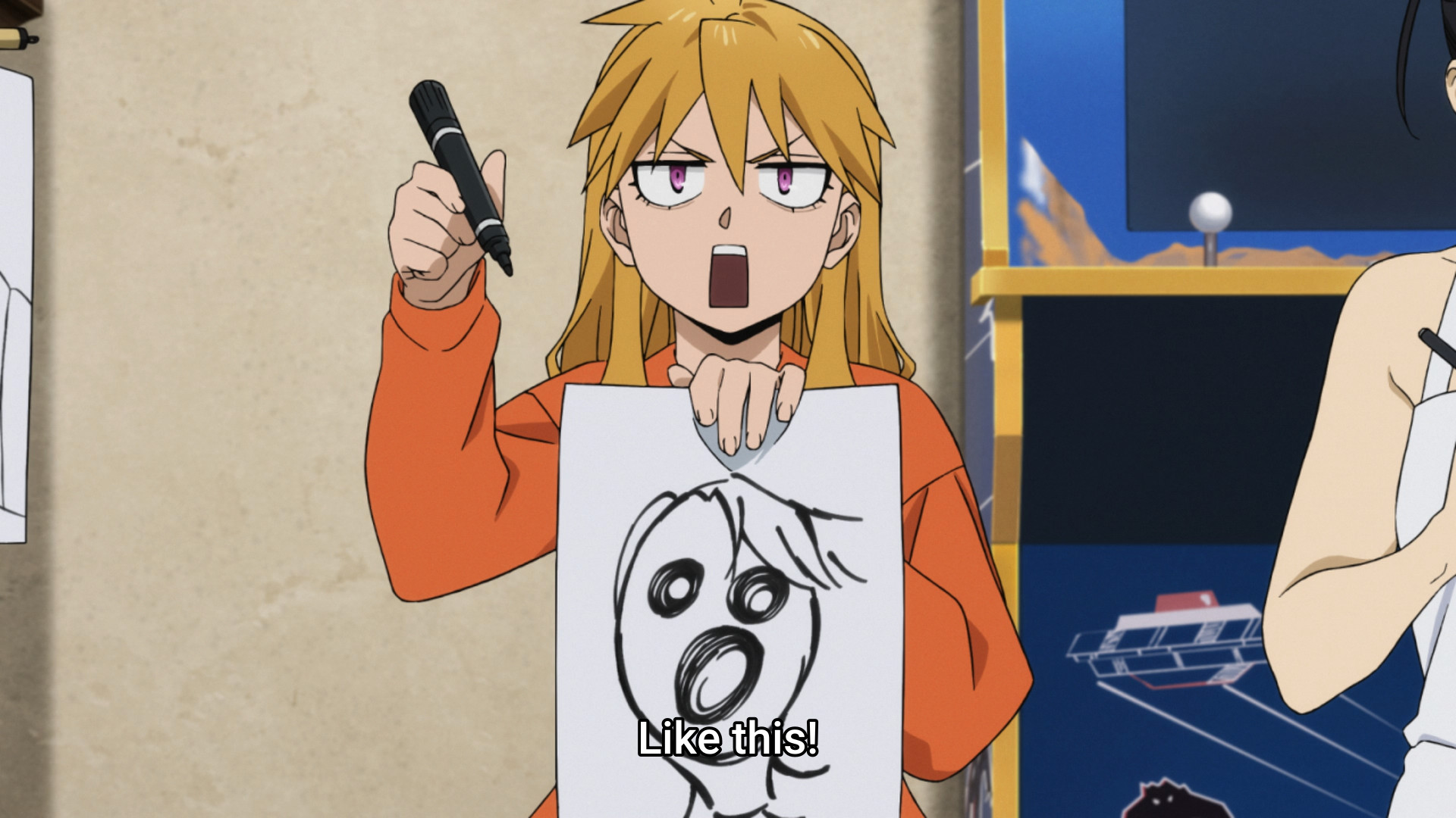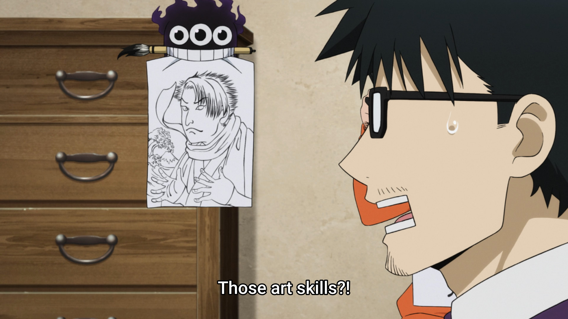 — Jin doesn’t know what Yuru looks like, so the girls take turns drawing portraits. I dunno, I think Asa’s attempt is pretty accurate, sparkles notwithstanding. Gabby, on the other hand, only has talent for killing people indiscriminately. As for her Daemon, uh…