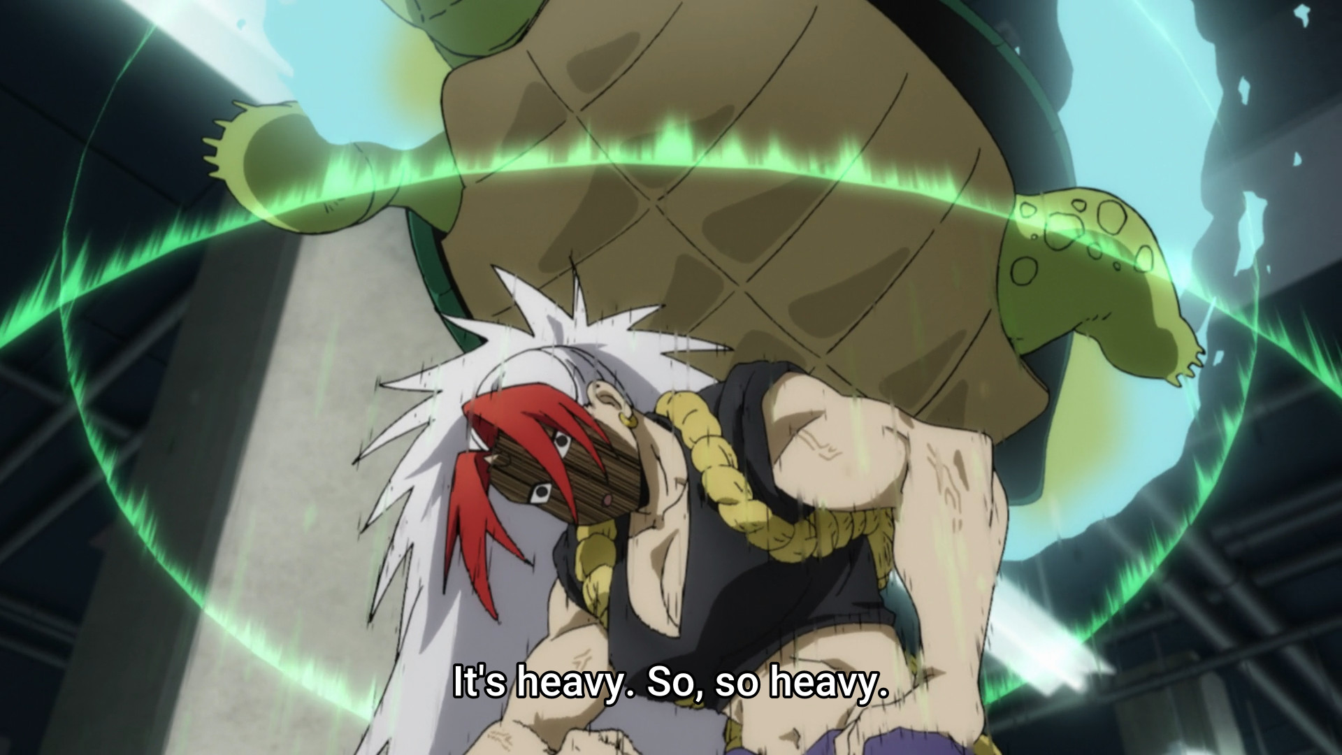 So we get a mini-skirmish between Yuru’s Daemons and Jin’s team. Always with the fighting. Alright, let’s just get through it. It looks like human weapons do nothing against Left and Right. The two of them are like, “We’re made of stone!” So the other side brings out the big guns: a tiny rabbit. Meanwhile, Left is pinned down by a turtle. How come the other guys get cute animals rather than ugly, burly humanoid Daemons? Well, I guess Left isn’t ugly. As an aside, her physique is what I’m talking about when I complain about Serafina in The Warrior Princess and the Barbaric King. They give her abs but these tiny, twig limbs. It makes no sense. She doesn’t have to be as big as Left, but a true warrior princess would be a little more robust than the supermodel thin heroine we got instead.