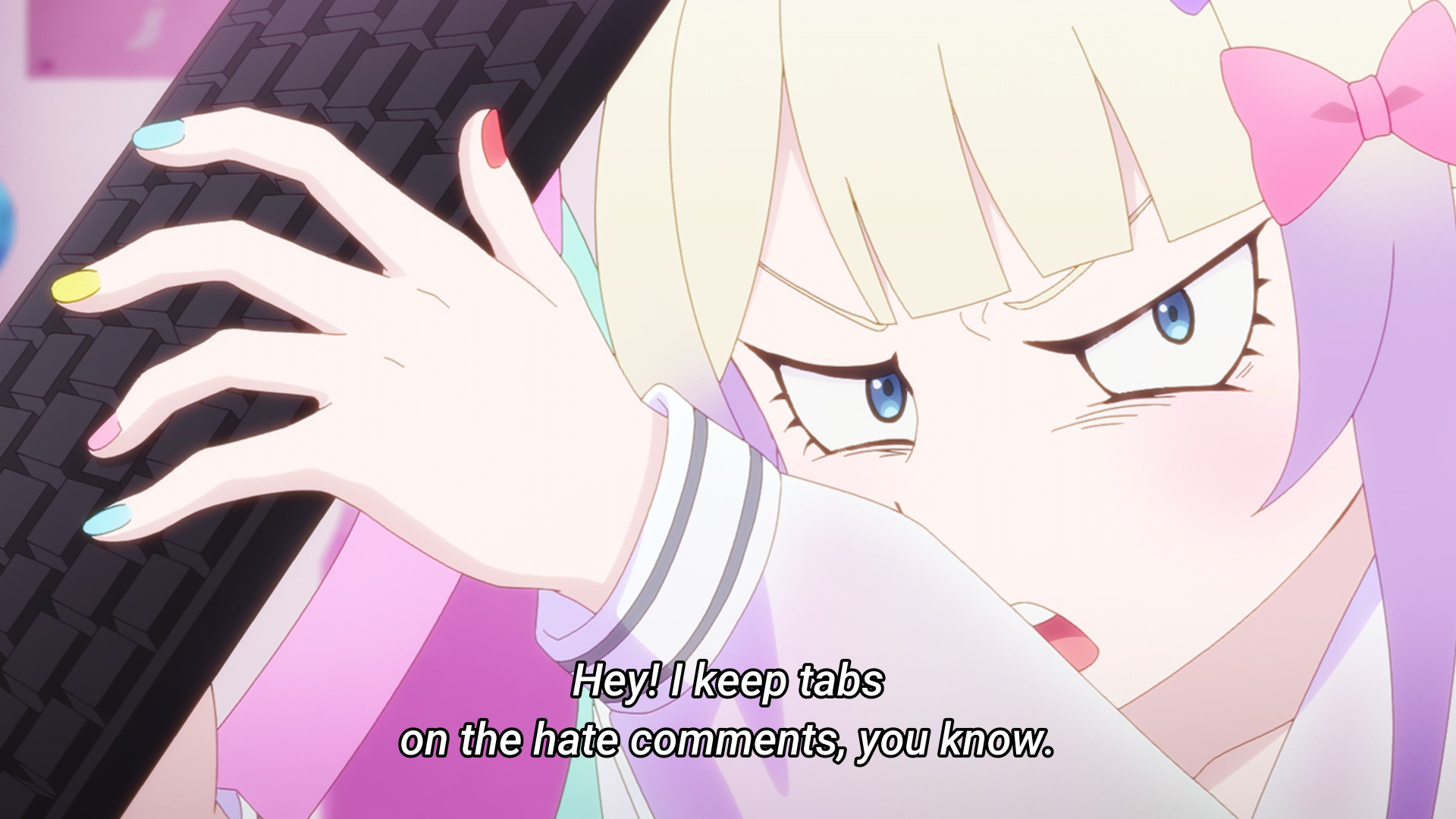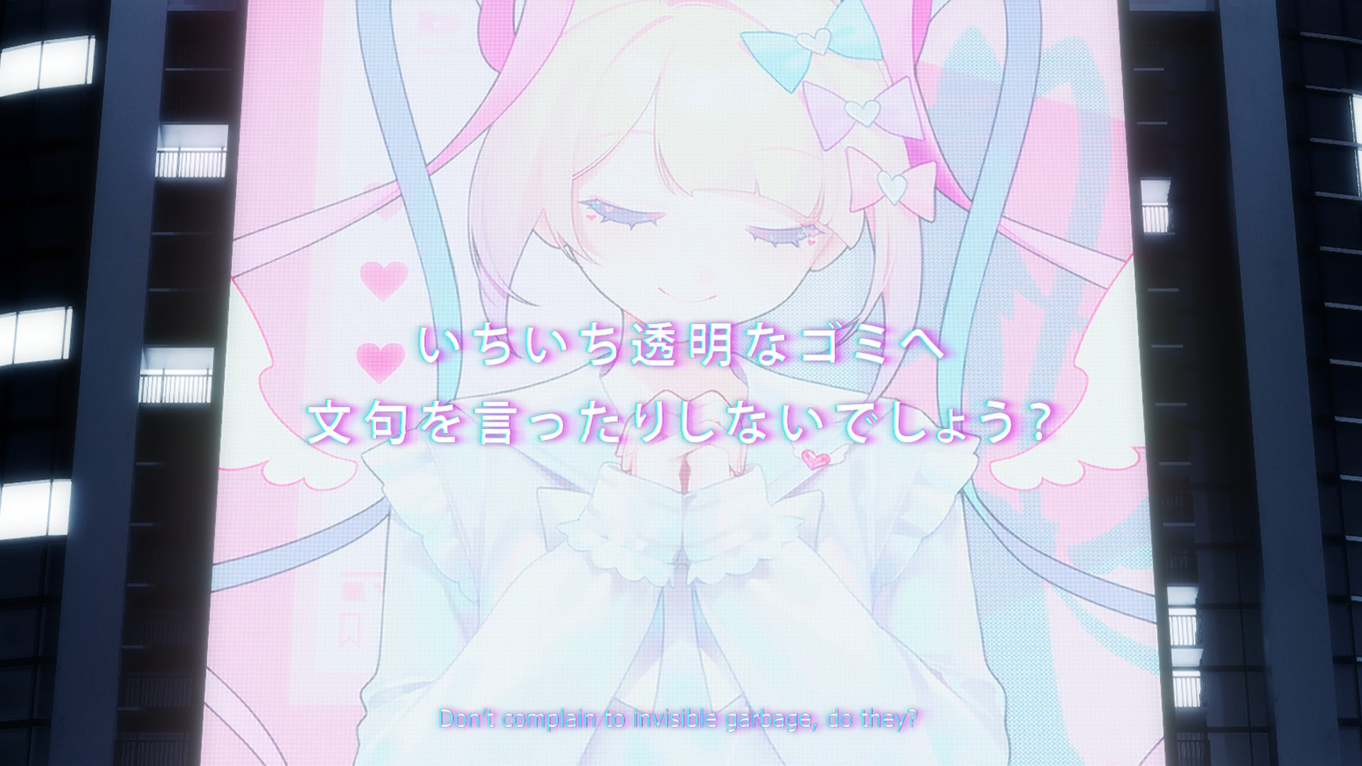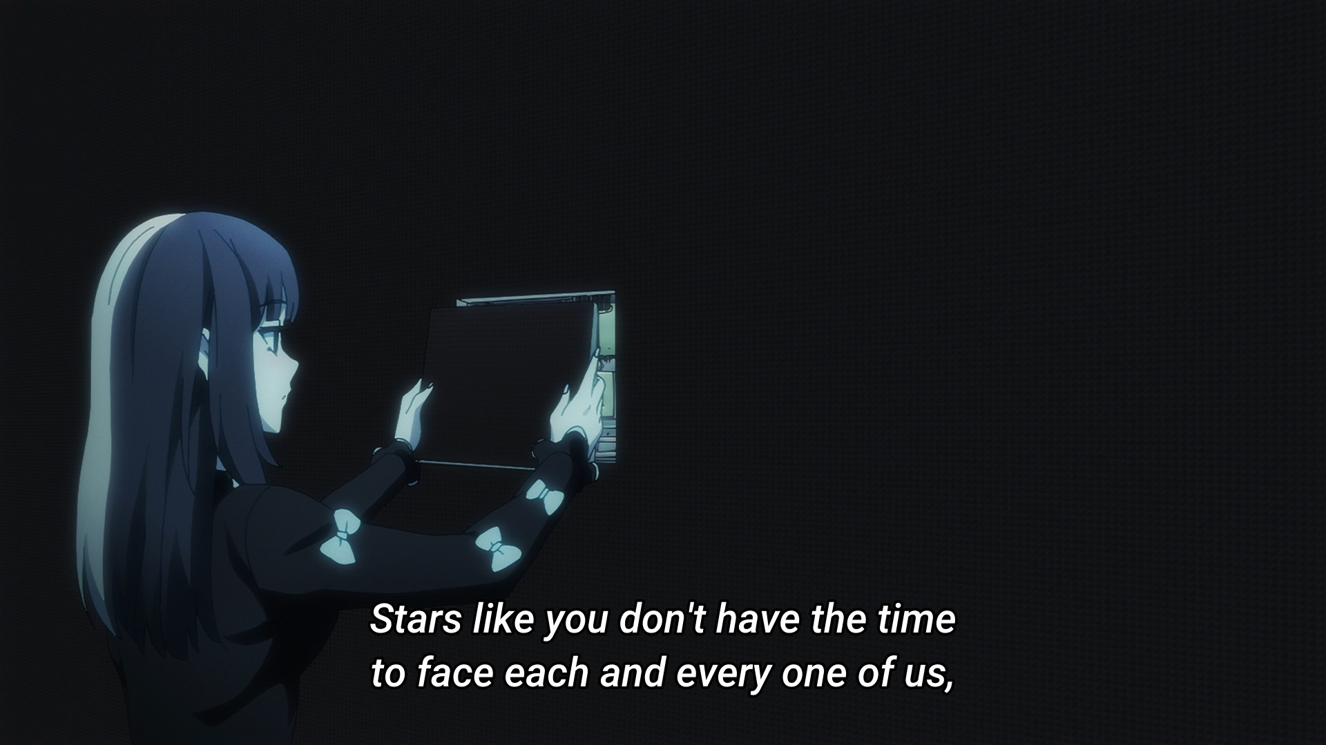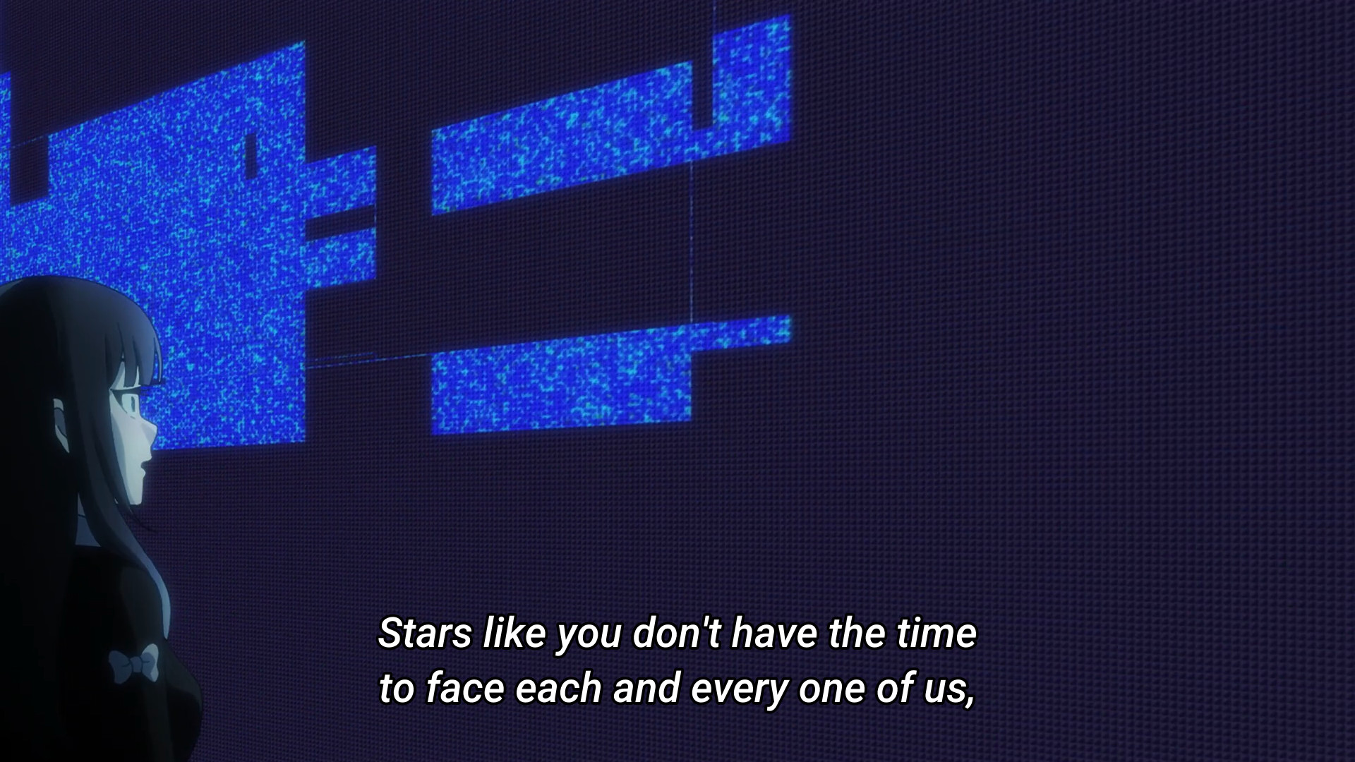 The episode opens with Kache seemingly trying to convince herself that she’s not like the others — that she’s merely ordinary, plain, boring, and thus utterly insignificant before the massive star powers of those like KAngel or Karamazov (though judging by their sub counts, I still don’t think they’re anywhere near the same level). But there’s a moment in this monologue that I find particularly interesting. I dunno what you call them (if they even have an official name), but there are these massive displays made up of smaller, tinier screens. Kache comes across one of them lying on the ground and picks it up. Neither the smaller screen or the bigger one are active. But when she puts the one in her hands back into its rightful place, the whole thing comes to life. Before you know it, KAngel looms over everyone. The internet superstar has her hands clasped together and her eyes closed as if she’s praying. This facade makes me think of the Virgin Mary or religious saints. And again, this display was defunct until Kache completed the “puzzle.” This “monument” to KAngel literally didn’t exist until she had every single “pixel.” It’s like how idols would be nothing without their fans. What even is a goddess without her worshippers? So Kache can lambast her position as a lowly “normie” all she wants, but it’s a reciprocal relationship. Sure, there are way more people like her than there are massive internet superstars, but the fans clearly matter. If they didn’t, content creators wouldn’t need to ego surf. If they didn’t, content creators wouldn’t desperately look for validation. And likewise, if fans were merely insignificant grains of sand, then why would their criticism — even anonymous ones — hurt so much?