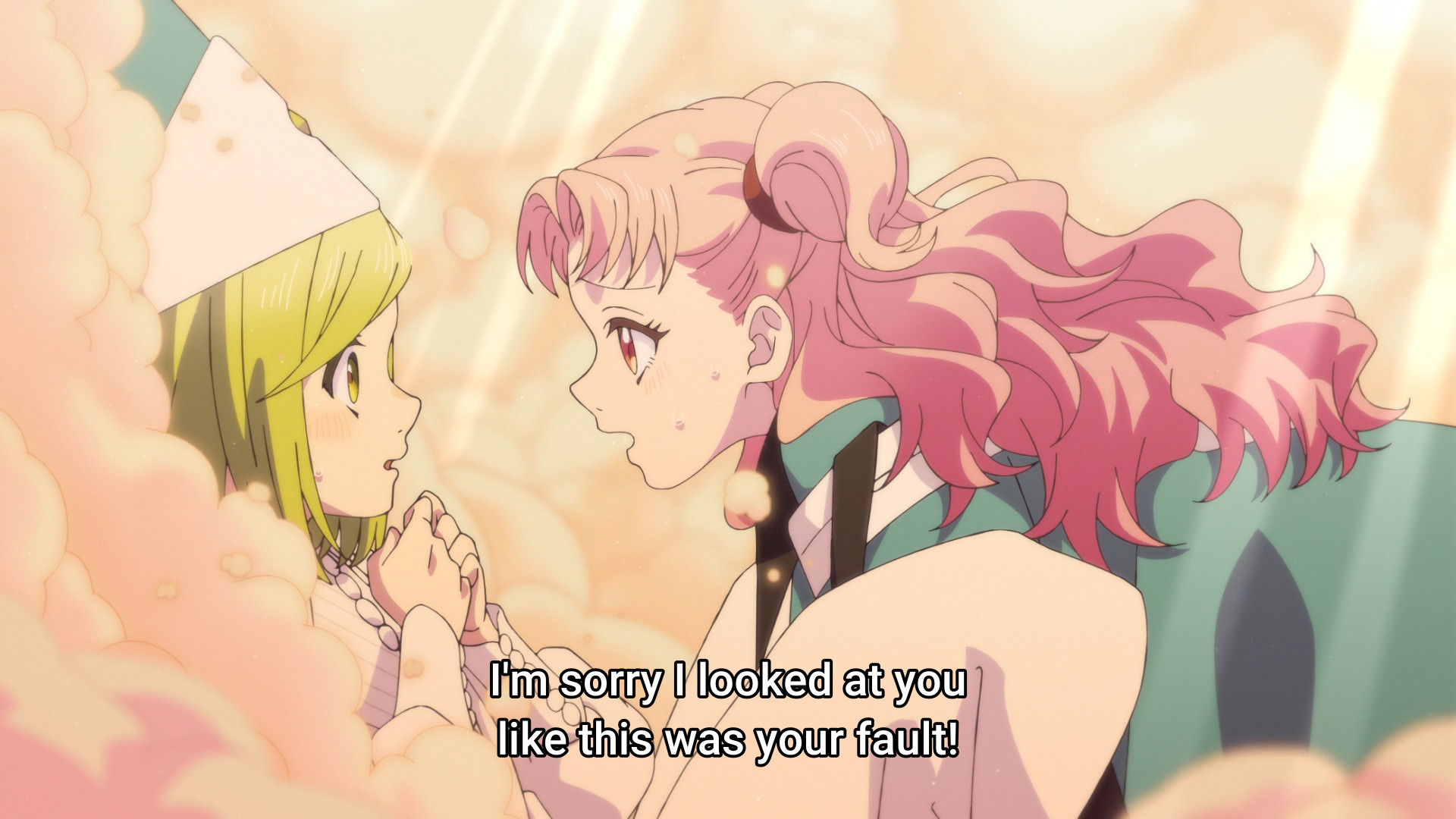Coco apologizes to Tetia for getting them into this mess. She also gives the girl a pep talk of sorts, since Tetia is the most freaked out of the four. All of a sudden, both of them are engulfed in a… puff ball? Cotton? Wool? Neither, apparently. It’s literally a fluffy cloud. Not to be a killjoy, but clouds are just water droplets… lots and lots of tiny water droplets. But fine, it’s magic so whatever. Sure, you can totally sleep on it. I thought you needed to draw stuff to cast a spell, but the cloud kinda felt like it appeared instantly. Who knows, maybe Tetia’s just super fast? And just like how they like thanking each other in loops, now they’re apologizing to each other in loops. Oh well, as long as the girlies get along. One down, two more girls to go.