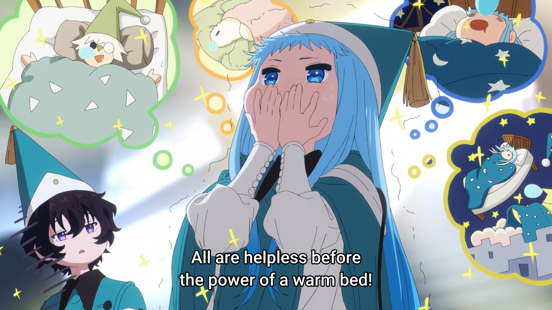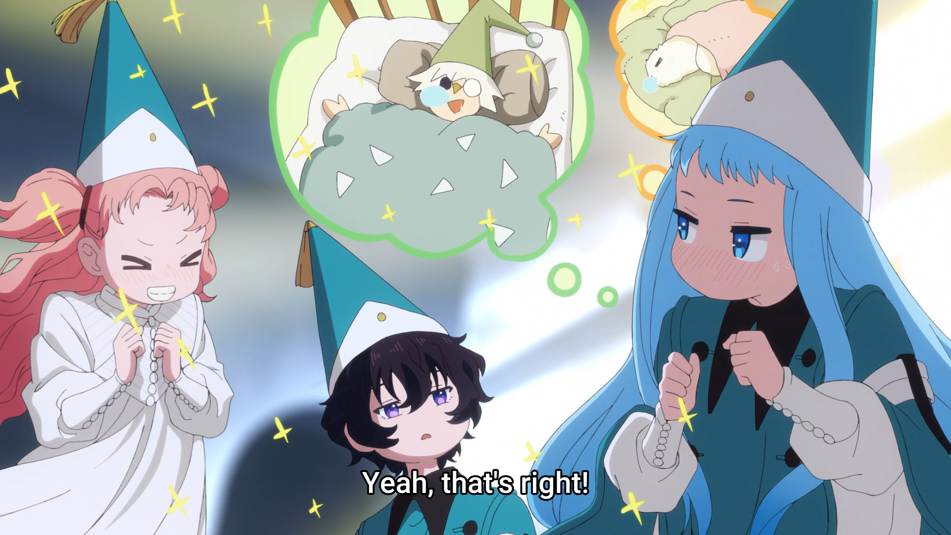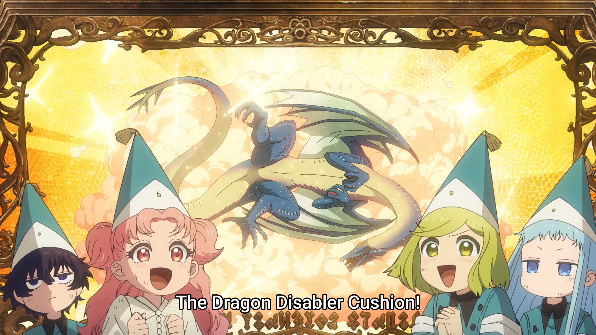 With everyone else focused on Agott for the time being, the Brimmed Cap witch takes a moment to say some cryptic nonsense to an unconscious Coco before fucking off. That’s just about all you can expect, huh? I mean, I gotta admit I’m a bit disappointed with how this episode ended. Sure, the animation was downright gorgeous. Absolutely amazing seeing the girls run around, drawing their spells. But the ending was just so… overdone. It’s nothing we haven’t seen before after such a promising start. Cool guy saves the day, and the antagonist claims victory and walks away. I really thought the fluffy bed would do the trick. I loved the idea of the girls teaming up and using ingenuity to solve the problem. But in the end, the story still resorted to destructive violence just so Qifrey could have some aura. The dragon didn’t die or anything, but still, I’m not convinced. Qifrey’s not redeemed. They wouldn’t be in this mess in the first place if the responsible adult in the room could keep an eye on his children. And then the thing with the Brimmed Cap, it’s cliche anime villain slop. It simply doesn’t get me excited for the next episode. How many times are these antagonists going to show up, say more cryptic shit, then disappear into the wind? Meh.