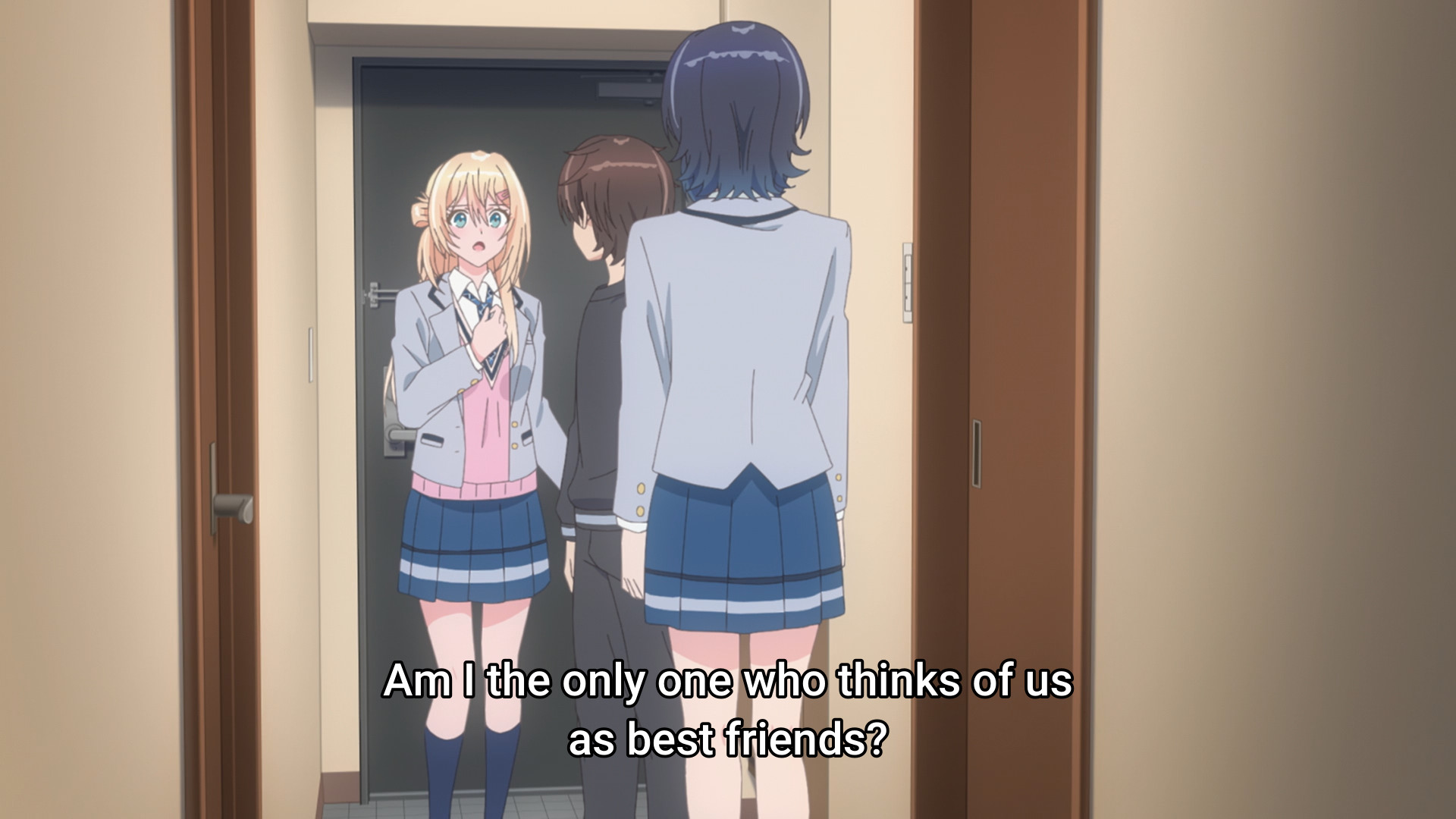 Eventually, Maki asks Umi if he could speak with her privately. She tries to turn him down, but her friends more or less force her hand. When Maki and Umi are alone, she scolds him because they’re supposed to keep their friendship a secret. How did he expose it? By asking to speak with her? Huh? Again, I’m just so fucking confused. I know what the implication is. He said he had something “important” to tell her. Idiots — like the ones in their class — might assume that he’s about to confess to her. But they’re also class reps, so they can always just make up an excuse that he had oh-so-important “class rep” matters to discuss with her. This is so stupid, I fucking swear. But after seeing him be so nice and patient with her despite, y’know, all of the above, Umi finally relents. She finally accepts that she needs to set things right. As a result, she swears that she’ll “fess” up to him after she hashes things out with Yuu. And right before the credits roll, we see Umi confronting those fake friends. “It’s my fault for being a green-eyed ass… but it’s really their fault if you think about it!” I jest, I jest… kinda. We’ll see how next week’s episode plays out.