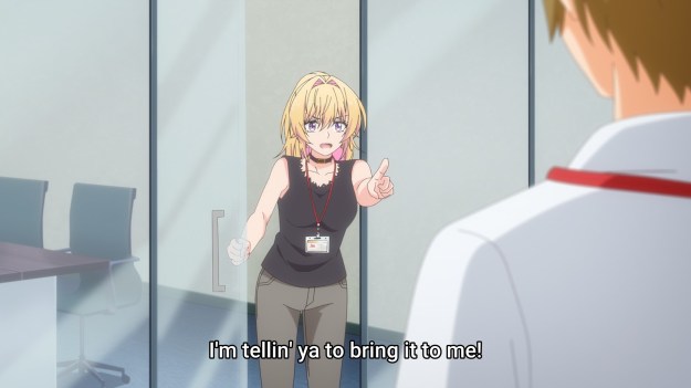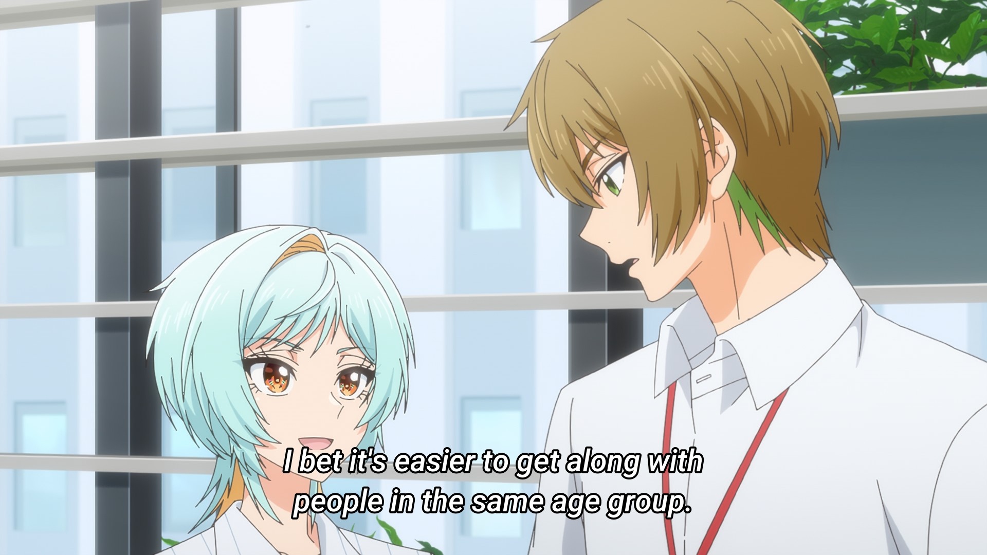 At the start of this week’s episode, Kannawa tries to tell Kamegawa to retrieve her phone through a variety of hand gestures. When he predictably fails to interpret her flailing movements, she finally opens the glass doors to tell him directly what she wants. Why didn’t she just do that from the start? Well, this is just one of the many examples of Kannawa and her kouhai struggling to be proper adults: