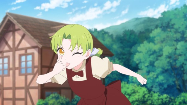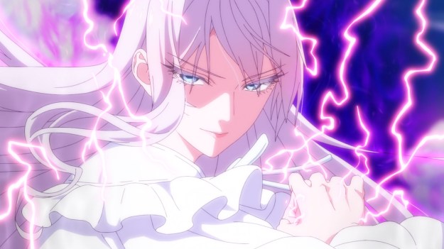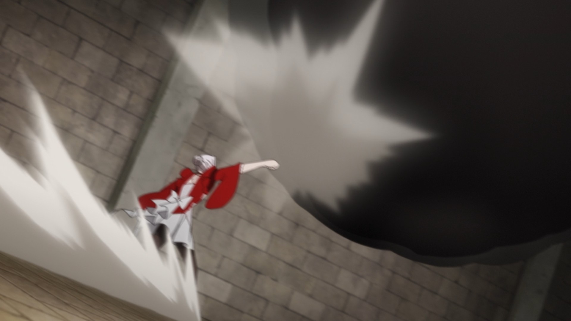 For better or worse, the early part of this episode is very video game-like. The party descends into the deep, dark dungeon full of traps. Ooh, what scary encounters might they face! There’s even a falling boulder that Scarlet has to fist out of the way. As you might have expected, our heroine makes short work of everyone and everything in her path. Eventually, the party makes its way to a large room full of Palmian adherents, so it’s time for a multi-stage boss fight.