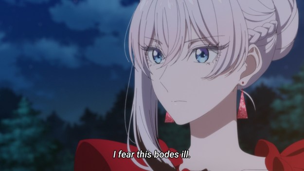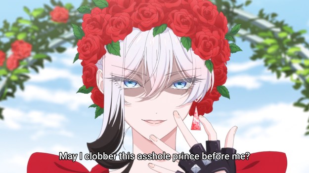 But before we get to Diana’s love life, we need to settle things with Palmia. When we last left off, the bad guys had disrupted a ceremony meant to kick off Saint Diana’s pilgrimage. Scarlet is quick to jump into action, so she chucks a single spear and demolishes an entire building belonging to the Palmiam faith. We then see a bunch of Palmian adherents gnash their teeth and curse the “blasphemer” who would dare attack them. On the one hand, we know these are the bad guys; we know they deserve it. But on the other hand, she is kinda overstepping her bounds. I suppose it helps to have the crown prince in your pocket, but still, Scarlet is playing judge, jury, and executioner. For now, the people are on her side. I just wonder if the story will ever consider having the pendulum swing the other way, i.e. the people slowly becoming scared of Scarlet for perhaps going too far one day. For example, Batman might be a hero, but he’s still a vigilante who some people reasonably oppose for his extrajudicial actions.